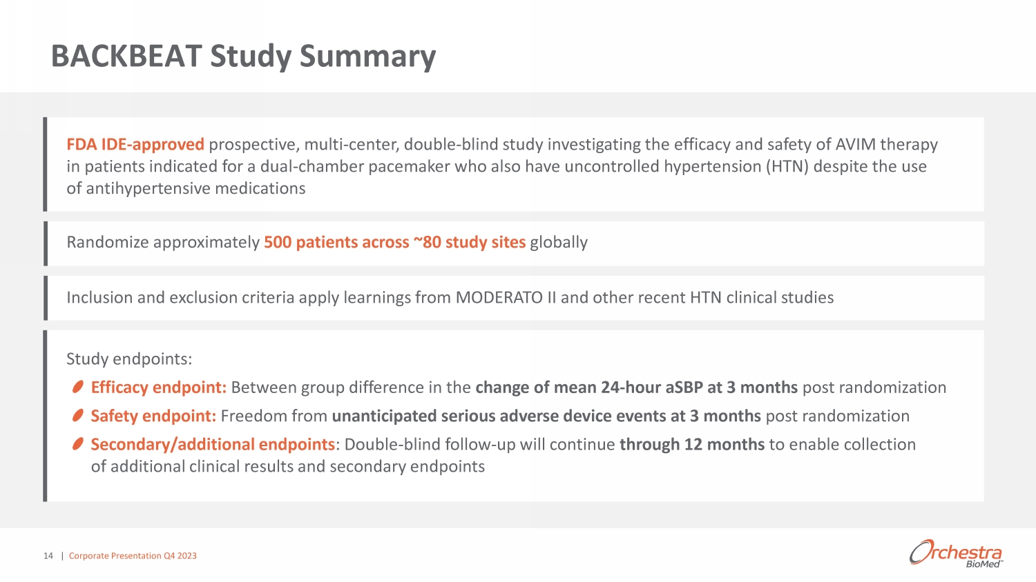 1 Kalaras et al. Journal of the American Heart Association. 2021;10:e020492 ahajournals.org/ doi /10.1161/JAHA.120.020492; 2 Burkhoff MODERATO II Study 2 - Year Results TCT 2021; 3 24 - Hr aSBP Control (n=19),1 control patient could not be measured despite repeat measurement (patient had extremely high blood pressure) ; D efinitions: Major Adverse Cardiac Events (MACE) included death, heart failure, clinically significant arrhythmias (i.e., persistent or increased atrial fibrillation, serious ventricular arr hyt hmias), myocardial infarction, stroke and renal failure in treatment group calculated per patient, Office Systolic Blood Pressure (oSBP); Ambulatory Systolic Blood Pressure (aSBP) Significant Reduction in 24 - Hr aSBP and oSBP 1,2 Control (n=20) 3 AVIM Therapy (n=26) - 11.1 mmHg - 17.5 mmHg 0 % 85% 13 6 Months 24 Months aSBP oSBP 6 Months 0 - 5 - 10 - 15 - 20 - 11.1 P < 0.001 - 12.4 P < 0.001 - 0.1 P = 0.94 - 17.5 P < 0.01 Δ - 12.3 p = 0.02 Δ - 8.1 p = 0.01 Δ in BP (mmHg) - 3.1 P = 0.17 - 15. 6 P < 0.001 - 1.5 P = 0.5 1 day Δ - 14.1 p = 0.001 ĂĐŬĞĂƚEd Ρ ;s/DƚŚĞƌĂƉLJͿ ƐŚŽǁĞĚĞŶĐŽƵƌĂŐŝŶŐƌĞƐƵůƚƐŝŶ DKZdK//͕ĂƉƌŽƐƉĞĐƚŝǀĞ͕ ŵƵůƚŝ Ͳ ĐĞŶƚĞƌ͕ƌĂŶĚŽŵŝnjĞĚ͕ ;ĂĐŬĞĂƚEdнŵĞĚŝĐĂů ƚŚĞƌĂƉLJǀƐ͘ĐŽŶƚŝŶƵĞĚŵĞĚŝĐĂů ƚŚĞƌĂƉLJͿ͕ĐŽŶƚƌŽůůĞĚ͕ĚŽƵďůĞ Ͳ ďůŝŶĚ͕ƉŝůŽƚƐƚƵĚLJŽĨƉĂĐĞŵĂŬĞƌ ƉĂƚŝĞŶƚƐǁŝƚŚƉĞƌƐŝƐƚĞŶƚ ŚLJƉĞƌƚĞŶƐŝŽŶ MODERATO II Randomized, Double - Blind Results | Corporate Presentation Q4 2023