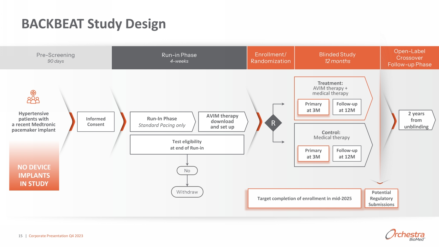 NO DEVICE IMPLANTS IN STUDY Hypertensive patients with a recent Medtronic pacemaker implant 15 Test eligibility at end of Run - in R Treatment: AVIM therapy + medical therapy WƌŝŵĂƌLJ Ăƚ ϯ D Control: Medical therapy Follow - up at 12M AVIM therapy download and set up Run - In Phase Standard Pacing only Withdraw No Informed Consent Pre - Screening 90 days Run - in Phase 4 - weeks Enrollment/ Randomization Blinded Study 12 months Open - Label Crossover Follow - up Phase WƌŝŵĂƌLJ Ăƚ ϯ D Follow - up at 12M BACKBEAT Study Design | Corporate Presentation Q 4 2023 Potential Regulatory Submissions 2 years from unblinding Target completion of enrollment in mid - 2025