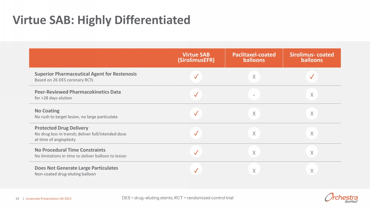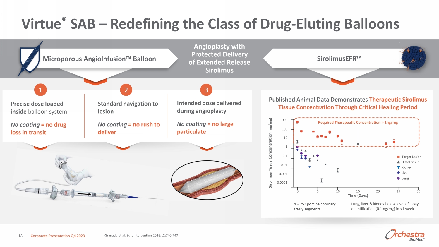 17 o Significant opportunity in an established multi - billion dollar market migrating toward drug - eluting balloons as the new standard of care o Highly - differentiated, best - in - class non - coated drug/device combination designed to overcome limitations of drug - coated balloons o Strategic collaboration with Terumo , a g lobal leader in interventional cardiology devices with >$ 2.5 B in annual division revenues C ollaboration w ith Designed to Enable Angioplasty with Protected Delivery of Extended - Release Sirolimus with Nothing Left Behind Virtue ® SAB overview | Corporate Presentation Q4 2023