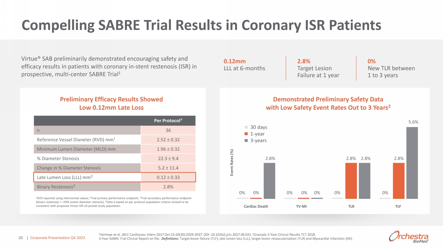 sŝƌƚƵĞ^ ;^ŝƌŽůŝŵƵƐ&ZͿ Paclitaxel - coated balloons Sirolimus - coated balloons Superior Pharmaceutical Agent for Restenosis Based on 26 DES coronary RCTs ض X ض Peer - Reviewed Pharmacokinetics Data for >28 days elution ض - X No Coating No rush to target lesion, no large particulate ض X X Protected Drug Delivery No drug loss in transit; deliver full/intended dose at time of angioplasty ض X X No Procedural Time Constraints No limitations in time to deliver balloon to lesion ض X X Does Not Generate Large Particulates Non - coated drug - eluting balloon ض X X Virtue SAB: Highly Differentiated 19 DES = drug - eluting stents; RCT = randomized control trial | Corporate Presentation Q4 2023