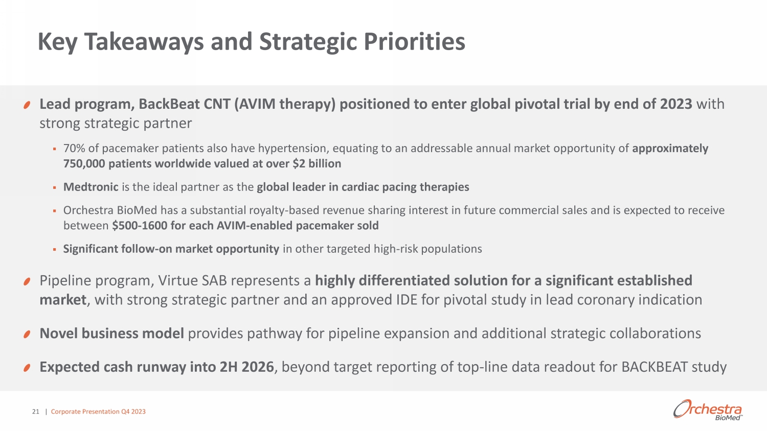 21 Lead program, BackBeat CNT (AVIM therapy) positioned to enter global pivotal trial by end of 2023 with strong strategic partner ▪ 70% of pacemaker patients also have hypertension, equating to an addressable annual market opportunity of approximately 750,000 patients worldwide valued at over $2 billion ▪ Medtronic is the ideal partner as the global leader in cardiac pacing therapies ▪ Orchestra BioMed has a substantial royalty - based revenue sharing interest in future commercial sales and is expected to receive between $500 - 1600 for each AVIM - enabled pacemaker sold ▪ Significant follow - on market opportunity in other targeted high - risk populations Pipeline program, Virtue SAB represents a highly differentiated solution for a significant established market , with strong strategic partner and an approved IDE for pivotal study in lead coronary indication Novel business model provides pathway for pipeline expansion and additional strategic collaborations Expected cash runway into 2H 2026 , beyond target reporting of top - line data readout for BACKBEAT study Key Takeaways and Strategic Priorities | Corporate Presentation Q4 2023