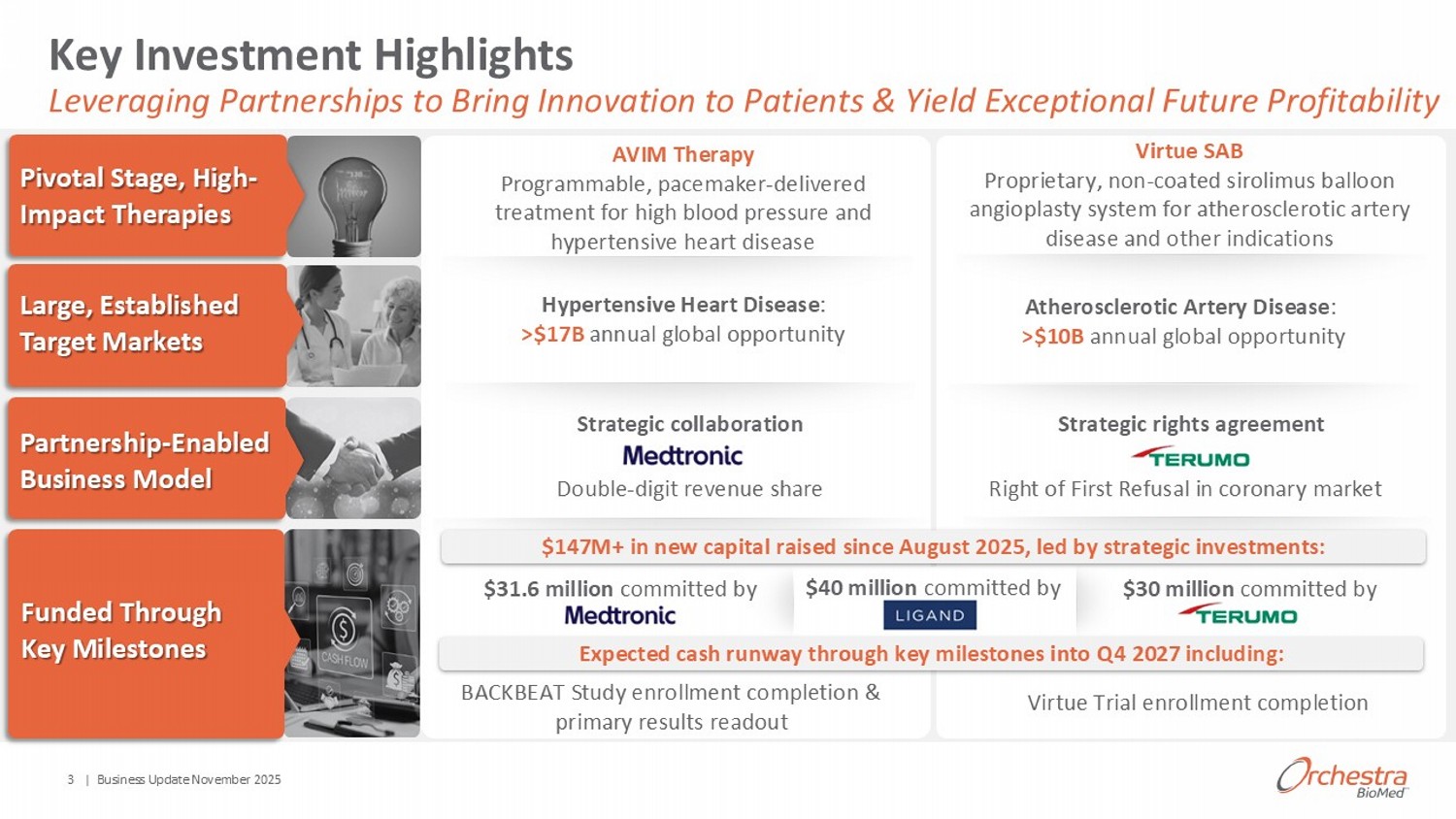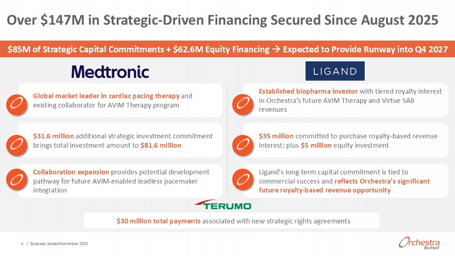 Over $147M in Strategic - Driven Financing Secured Since August 2025 Ψ ϴϱ DŽĨ^ƚƌĂƚĞŐŝĐĂƉŝƚĂůŽŵŵŝƚŵĞŶƚƐнΨ ϲϮ͘ϲ DƋƵŝƚLJ&ŝŶĂŶĐŝŶŐ Æ džƉĞĐƚĞĚƚŽWƌŽǀŝĚĞZƵŶǁĂLJŝŶƚŽ Y ϰ ϮϬϮϳ Ψ ϯϱ ŵŝůůŝŽŶ ĐŽŵŵŝƚƚĞĚƚŽƉƵƌĐŚĂƐĞƌŽLJĂůƚLJ Ͳ ďĂƐĞĚƌĞǀĞŶƵĞ ŝŶƚĞƌĞƐƚ͖ƉůƵƐ Ψ ϱ ŵŝůůŝŽŶ ĞƋƵŝƚLJŝŶǀĞƐƚŵĞŶƚ $ 31.6 million additional strategic investment commitment brings total investment amount to $ 81.6 million Ligand’s long - term capital commitment is tied to commercial success and reflects Orchestra’s significant future royalty - based revenue opportunity Collaboration expansion provides potential development pathway for future AVIM - enabled leadless pacemaker integration ƐƚĂďůŝƐŚĞĚďŝŽƉŚĂƌŵĂŝŶǀĞƐƚŽƌ ǁŝƚŚƚŝĞƌĞĚƌŽLJĂůƚLJŝŶƚĞƌĞƐƚ ŝŶKƌĐŚĞƐƚƌĂ ͛ ƐĨƵƚƵƌĞs/DdŚĞƌĂƉLJĂŶĚsŝƌƚƵĞ^ ƌĞǀĞŶƵĞƐ 'ůŽďĂůŵĂƌŬĞƚůĞĂĚĞƌŝŶĐĂƌĚŝĂĐƉĂĐŝŶŐƚŚĞƌĂƉLJ ĂŶĚ ĞdžŝƐƚŝŶŐĐŽůůĂďŽƌĂƚŽƌĨŽƌs/DdŚĞƌĂƉLJƉƌŽŐƌĂŵ 4 Ψ ϯϬ ŵŝůůŝŽŶƚŽƚĂůƉĂLJŵĞŶƚƐ ĂƐƐŽĐŝĂƚĞĚǁŝƚŚŶĞǁƐƚƌĂƚĞŐŝĐƌŝŐŚƚƐĂŐƌĞĞŵĞŶƚƐ ͮƵƐŝŶĞƐƐhƉĚĂƚĞEŽǀĞŵďĞƌ ϮϬϮϱ