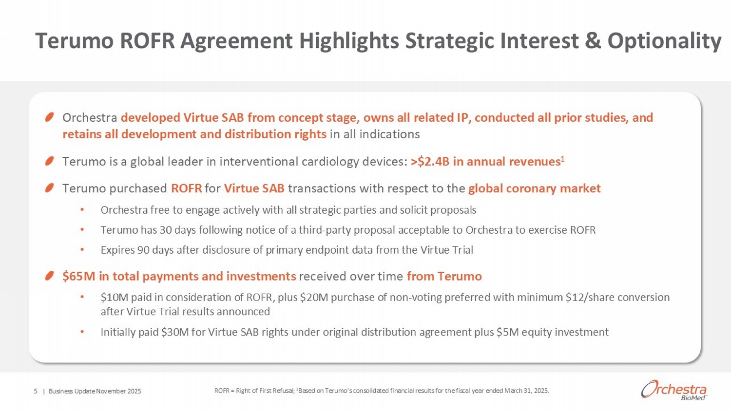 Orchestra developed Virtue SAB from concept stage, owns all related IP, conducted all prior studies, and retains all development and distribution rights in all indications Terumo is a global leader in interventional cardiology devices: >$2.4B in annual revenues 1 Terumo purchased ROFR for Virtue SAB transactions with respect to the global coronary market • Orchestra free to engage actively with all strategic parties and solicit proposals • Terumo has 30 days following notice of a third - party proposal acceptable to Orchestra to exercise ROFR • Expires 90 days after disclosure of primary endpoint data from the Virtue Trial $65M in total payments and investments received over time from Terumo • $10M paid in consideration of ROFR, plus $20M purchase of non - voting preferred with minimum $12/share conversion after Virtue Trial results announced • Initially paid $30M for Virtue SAB rights under original distribution agreement plus $5M equity investment Terumo ROFR Agreement Highlights Strategic Interest & Optionality ROFR = Right of First Refusal; 1 Based on Terumo’s consolidated financial results for the fiscal year ended March 31, 2025. ϱ | Business Update November 2025