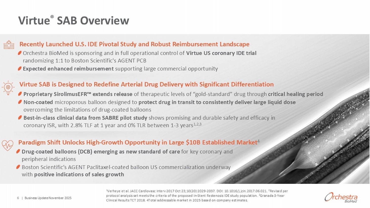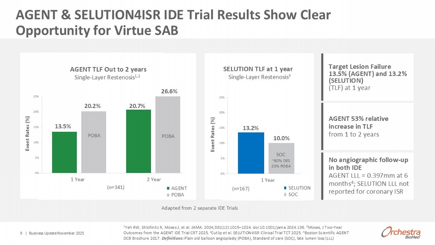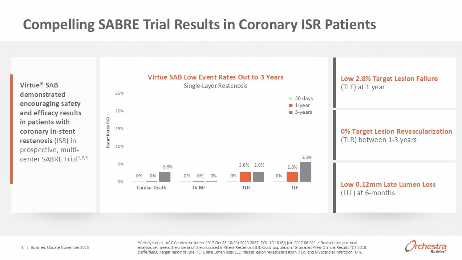 >Žǁ Ϯ͘ϴ йdĂƌŐĞƚ>ĞƐŝŽŶ&ĂŝůƵƌĞ ;d>&ͿĂƚ ϭ LJĞĂƌ >Žǁ Ϭ͘ϭϮ ŵŵ>ĂƚĞ>ƵŵĞŶ>ŽƐƐ ;>>>ͿĂƚ ϲ Ͳ ŵŽŶƚŚƐ 0% Target Lesion Revascularization (TLR) between 1 - 3 years Virtue® SAB demonstrated encouraging safety and efficacy results in patients with coronary in - stent restenosis (ISR) in prospective, multi - center SABRE Trial 1,2,3 Compelling SABRE Trial Results in Coronary ISR Patients sŝƌƚƵĞ^>ŽǁǀĞŶƚZĂƚĞƐKƵƚƚŽ ϯ zĞĂƌƐ ^ŝŶŐůĞ Ͳ >ĂLJĞƌZĞƐƚĞŶŽƐŝƐ 0% 5% 10% 15% 20% 25% ϱ͘ϲ й 2.8% Ϯ͘ϴ й Ϯ͘ϴ й 0% 0% 0% Ϭ й Ϭ й 0% Ϭ й Ϯ͘ϴ й Cardiac Death TV - MI TLR d>& ǀĞŶƚZĂƚĞƐ;йͿ 30 days 1 - year 3 - years ϭ sĞƌŚĞLJĞĞƚĂů͘:ĂƌĚŝŽǀĂƐĐ/ŶƚĞƌǀ ϮϬϭϳ KĐƚ Ϯϯ ͖ ϭϬ ; ϮϬ Ϳ͗ ϮϬϮϵ Ͳ ϮϬϯϳ ͘K/͗ ϭϬ͘ϭϬϭϲ ͬũ͘ũĐŝŶ͘ ϮϬϭϳ͘Ϭϲ͘ϬϮϭ ͘ Ϯ ZĞǀŝƐĞĚƉĞƌƉƌŽƚŽĐŽů ĂŶĂůLJƐŝƐƐĞƚŵĞĞƚƐƚŚĞĐƌŝƚĞƌŝĂŽĨƚŚĞƉƌŽƉŽƐĞĚ/Ŷ Ͳ ^ƚĞŶƚZĞƐƚĞŶŽƐŝƐ/ƐƚƵĚLJƉŽƉƵůĂƚŝŽŶ͘ ϯ 'ƌĂŶĂĚĂ ϯ Ͳ zĞĂƌůŝŶŝĐĂůZĞƐƵůƚƐdd ϮϬϭϴ ͘ ĞĨŝŶŝƚŝŽŶƐ͗ dĂƌŐĞƚůĞƐŝŽŶĨĂŝůƵƌĞ;d>&Ϳ͕ůĂƚĞůƵŵĞŶůŽƐƐ;>>>Ϳ͕ƚĂƌŐĞƚůĞƐŝŽŶƌĞǀĂƐĐƵůĂƌŝnjĂƚŝŽŶ;d>ZͿĂŶĚDLJŽĐĂƌĚŝĂů/ŶĨĂƌĐƚŝŽŶ;D/Ϳ͘ ϴ | Business Update November 2025