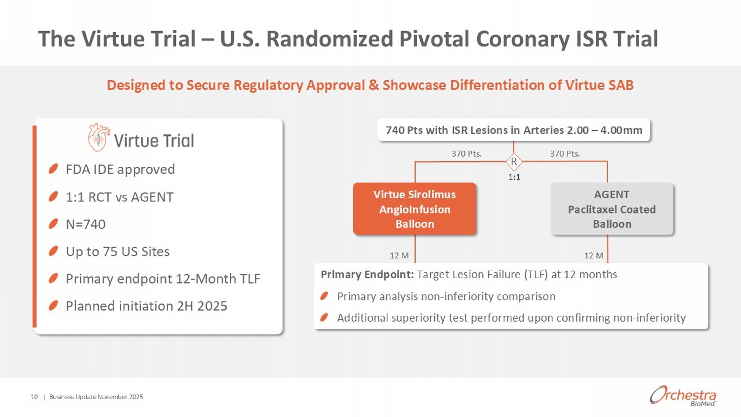 The Virtue Trial – U.S. Randomized Pivotal Coronary ISR Trial Designed to Secure Regulatory Approval & Showcase Differentiation of Virtue SAB R ϳϰϬ WƚƐǁŝƚŚ/^Z>ĞƐŝŽŶƐŝŶƌƚĞƌŝĞƐ Ϯ͘ϬϬ ʹ ϰ͘ϬϬ ŵŵ sŝƌƚƵĞ^ŝƌŽůŝŵƵƐ ŶŐŝŽ/ŶĨƵƐŝŽŶ ĂůůŽŽŶ 1:1 ϯϳϬ WƚƐ͘ ϯϳϬ WƚƐ͘ 12 M 12 M Clinical Follow - Up out to 5 Years WƌŝŵĂƌLJŶĚƉŽŝŶƚ͗ dĂƌŐĞƚ>ĞƐŝŽŶ&ĂŝůƵƌĞ;d>&ͿĂƚ ϭϮ ŵŽŶƚŚƐ WƌŝŵĂƌLJĂŶĂůLJƐŝƐŶŽŶ Ͳ ŝŶĨĞƌŝŽƌŝƚLJĐŽŵƉĂƌŝƐŽŶ ĚĚŝƚŝŽŶĂůƐƵƉĞƌŝŽƌŝƚLJƚĞƐƚƉĞƌĨŽƌŵĞĚƵƉŽŶĐŽŶĨŝƌŵŝŶŐŶŽŶ Ͳ ŝŶĨĞƌŝŽƌŝƚLJ 'Ed WĂĐůŝƚĂdžĞůŽĂƚĞĚ ĂůůŽŽŶ FDA IDE approved 1:1 RCT vs AGENT N=740 Up to 75 US Sites Primary endpoint 12 - Month TLF Planned initiation 2H 2025 ϭϬ ͮƵƐŝŶĞƐƐhƉĚĂƚĞEŽǀĞŵďĞƌ ϮϬϮϱ