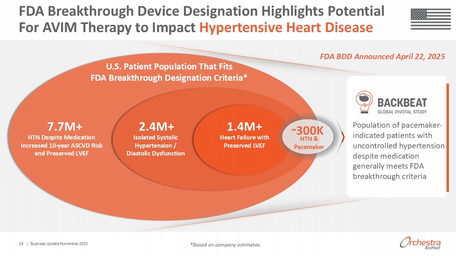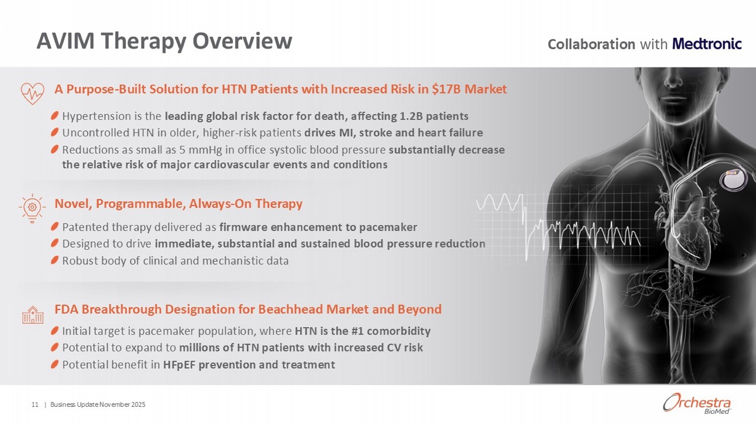 AVIM Therapy Overview Hypertension is the leading global risk factor for death, affecting 1.2B patients Uncontrolled HTN in older, higher - risk patients drives MI, stroke and heart failure Reductions as small as 5 mmHg in office systolic bloo d pressure substantially decrease the relative risk of major cardiovascular events and conditions A Purpose - Built Solution for HTN Patients with Increased Risk in $17B Market WĂƚĞŶƚĞĚƚŚĞƌĂƉLJĚĞůŝǀĞƌĞĚĂƐ ĨŝƌŵǁĂƌĞĞŶŚĂŶĐĞŵĞŶƚƚŽƉĂĐĞŵĂŬĞƌ ĞƐŝŐŶĞĚƚŽĚƌŝǀĞ ŝŵŵĞĚŝĂƚĞ͕ƐƵďƐƚĂŶƚŝĂůĂŶĚƐƵƐƚĂŝŶĞĚďůŽŽĚƉƌĞƐƐƵƌĞƌĞĚƵĐƚŝŽŶ ZŽďƵƐƚďŽĚLJŽĨĐůŝŶŝĐĂůĂŶĚŵĞĐŚĂŶŝƐƚŝĐĚĂƚĂ /ŶŝƚŝĂůƚĂƌŐĞƚŝƐƉĂĐĞŵĂŬĞƌƉŽƉƵůĂƚŝŽŶ͕ǁŚĞƌĞ ,dEŝƐƚŚĞη ϭ ĐŽŵŽƌďŝĚŝƚLJ WŽƚĞŶƚŝĂůƚŽĞdžƉĂŶĚƚŽ ŵŝůůŝŽŶƐŽĨ,dEƉĂƚŝĞŶƚƐǁŝƚŚŝŶĐƌĞĂƐĞĚsƌŝƐŬ WŽƚĞŶƚŝĂůďĞŶĞĨŝƚŝŶ ,&Ɖ&ƉƌĞǀĞŶƚŝŽŶĂŶĚƚƌĞĂƚŵĞŶƚ FDA Breakthrough Designation for Beachhead Market and Beyond EŽǀĞů͕ WƌŽŐƌĂŵŵĂďůĞ͕ůǁĂLJƐ Ͳ KŶ dŚĞƌĂƉLJ ŽůůĂďŽƌĂƚŝŽŶ ǁŝƚŚ 11 | Business Update November 2025