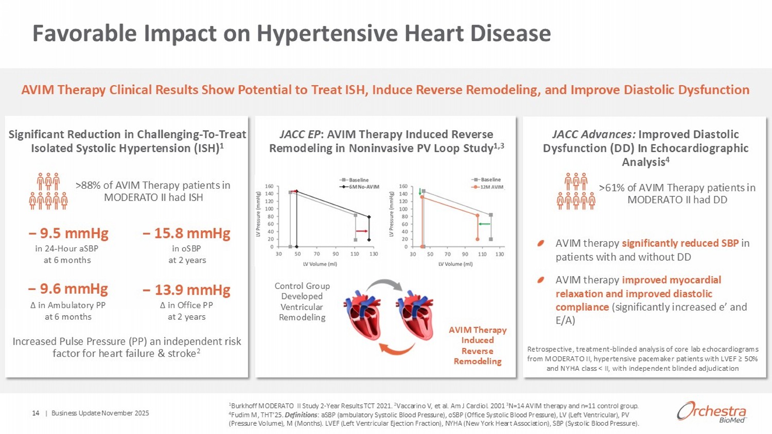 FDA Breakthrough Device Designation Highlights Potential For AVIM Therapy to Impact Hypertensive Heart Disease ΎĂƐĞĚŽŶĐŽŵƉĂŶLJĞƐƚŝŵĂƚĞƐ͘ WŽƉƵůĂƚŝŽŶŽĨƉĂĐĞŵĂŬĞƌ Ͳ ŝŶĚŝĐĂƚĞĚƉĂƚŝĞŶƚƐǁŝƚŚ ƵŶĐŽŶƚƌŽůůĞĚŚLJƉĞƌƚĞŶƐŝŽŶ ĚĞƐƉŝƚĞŵĞĚŝĐĂƚŝŽŶ ŐĞŶĞƌĂůůLJŵĞĞƚƐ& ďƌĞĂŬƚŚƌŽƵŐŚĐƌŝƚĞƌŝĂ HTN Despite Medication Increased 10 - year ASCVD R isk and Preserved LVEF 7.7M+ U.S. Patient Population That Fits FDA Breakthrough Designation Criteria* /ƐŽůĂƚĞĚ^LJƐƚŽůŝĐ ,LJƉĞƌƚĞŶƐŝŽŶͬ ŝĂƐƚŽůŝĐLJƐĨƵŶĐƚŝŽŶ Ϯ͘ϰ Dн Heart Failure with Preserved LVEF ϭ͘ϰ Dн ,dEΘ WĂĐĞŵĂŬĞƌ ~ 300K FDA BDD Announced April 22, 2025 13 ͮƵƐŝŶĞƐƐhƉĚĂƚĞEŽǀĞŵďĞƌ ϮϬϮϱ