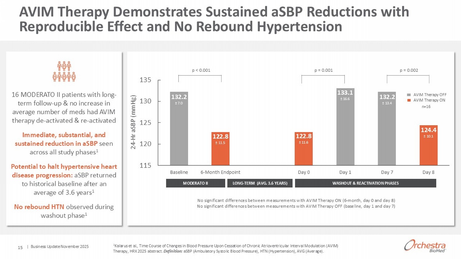 s/DdŚĞƌĂƉLJĞŵŽŶƐƚƌĂƚĞƐ^ƵƐƚĂŝŶĞĚĂ^WZĞĚƵĐƚŝŽŶƐǁŝƚŚ ZĞƉƌŽĚƵĐŝďůĞĨĨĞĐƚĂŶĚEŽZĞďŽƵŶĚ,LJƉĞƌƚĞŶƐŝŽŶ 15 115 120 125 130 135 Baseline 6-Month Endpoint Day 0 Day 1 Day 7 Day 8 24 - Hr aSBP (mmHg) 122.8 ц 11.6 ϭϯϯ͘ϭ ц ϭϲ͘ϲ ϭϯϮ͘Ϯ ц ϭϯ͘ϰ 124.4 ц 10.1 Ɖс Ϭ͘ϬϬϭ Ɖс Ϭ͘ϬϬϮ 132.2 ц 7.0 122.8 ц 11.5 p < 0.001 DKZdK// s/DdŚĞƌĂƉLJK&& s/DdŚĞƌĂƉLJKE 16 MODERATO II patients with long - term follow - up & no increase in average number of meds had AVIM therapy de - activated & re - activated Immediate, substantial, and sustained reduction in aSBP seen across all study phases 1 Potential to halt hypertensive heart disease progression: aSBP returned to historical baseline after an average of 3.6 years 1 No rebound HTN observed during washout phase 1 t^,KhdΘZd/sd/KEW,^^ >KE' Ͳ dZD;s'͘ ϯ͘ϲ zZ^Ϳ No significant differences between measurements with AVIM Therapy ON (6 - month, day 0 and day 8) No significant differences between measurements with AVIM Therapy OFF (baseline, day 1 and day 7) 1 Kalarus et al., Time Course of Changes in Blood Pressure Upon Cessation of Chronic Atrioventricular Interval Modulation (AVIM ) Therapy, HRX 2025 abstract. Definition: aSBP (Ambulatory Systolic Blood Pressure), HTN (Hypertension), AVG (Average). n=16 ͮƵƐŝŶĞƐƐhƉĚĂƚĞEŽǀĞŵďĞƌ ϮϬϮϱ