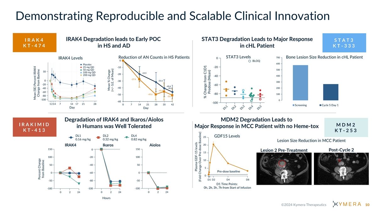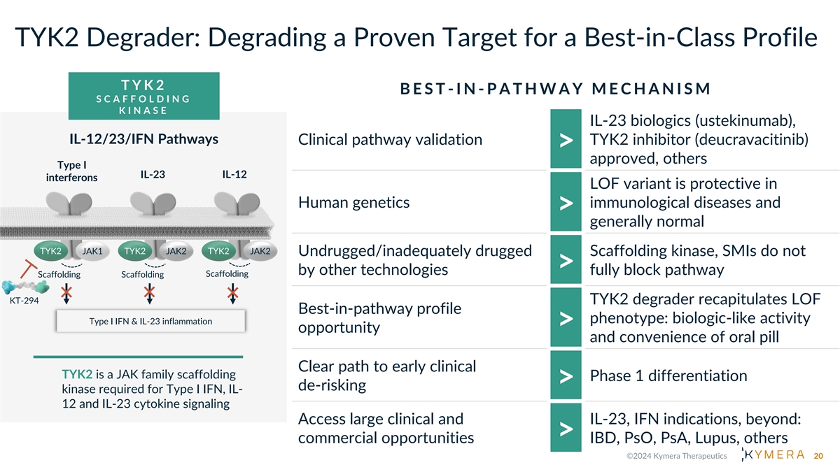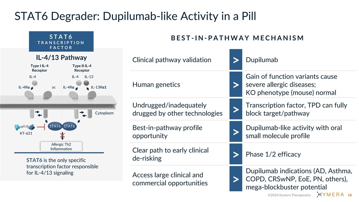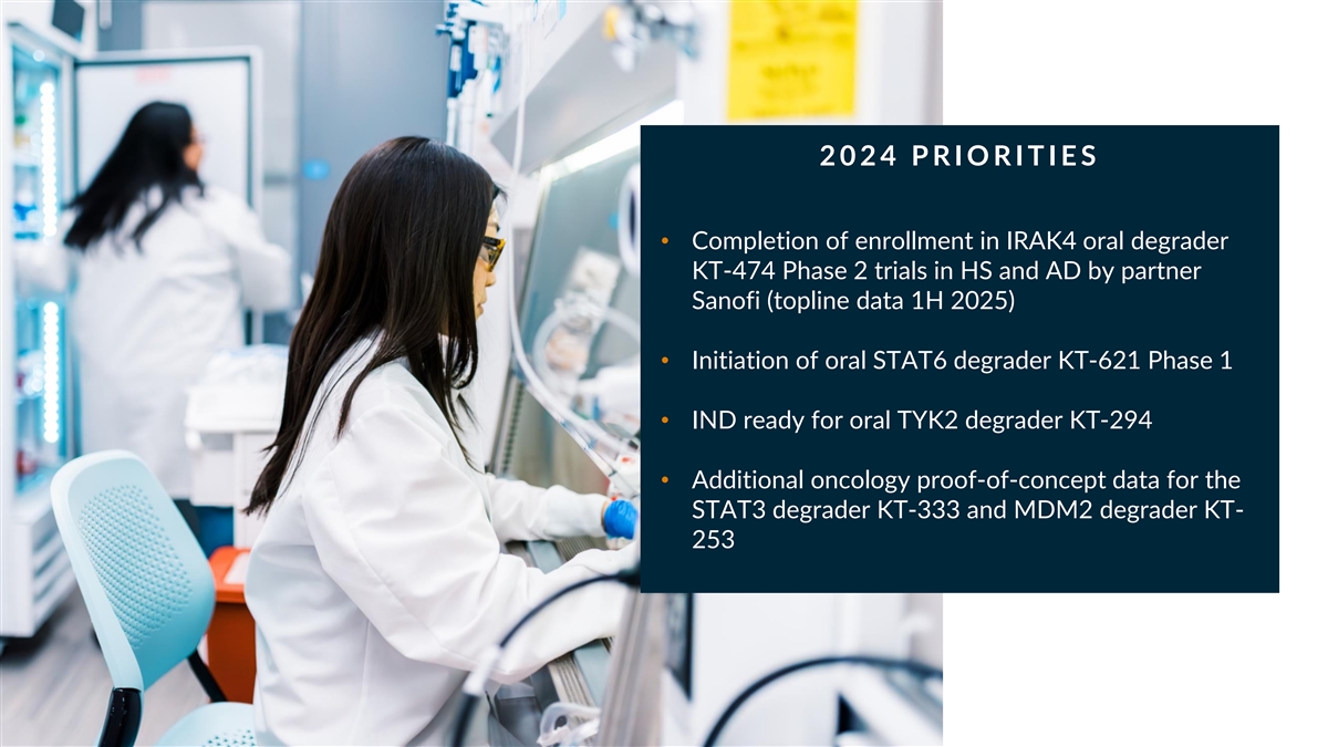 2 0 2 4 P R I O R I T I E S • Completion of enrollment in IRAK4 oral degrader KT-474 Phase 2 trials in HS and AD by partner Sanofi (topline data 1H 2025) • Initiation of oral STAT6 degrader KT-621 Phase 1 • IND ready for oral TYK2 degrader KT-294 • Additional oncology proof-of-concept data for the STAT3 degrader KT-333 and MDM2 degrader KT- 253
