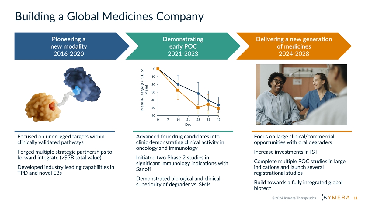 Demonstrating Reproducible and Scalable Clinical Innovation IRAK4 Degradation leads to Early POC STAT3 Degradation Leads to Major Response I R A K 4 S T A T 3 KT - 474 in HS and AD in cHL Patient KT - 333 STAT3 Levels 700 Bone Lesion Size Reduction in cHL Patient Reduction of AN Counts in HS Patients IRAK4 Levels 0 600 -10 500 -19.9 -20 400 -27.4 -31.6 -30 300 -40.6 -40 200 -46.1 -45.4 100 -50 -49.6 -50.7 0 -60 0 7 14 21 28 35 42 Screening Cycle 5 Day 1 Day Degradation of IRAK4 and Ikaros/Aiolos MDM2 Degradation Leads to I R A K I M I D M D M 2 in Humans was Well Tolerated Major Response in MCC Patient with no Heme-tox KT - 413 KT - 253 GDF15 Levels Lesion Size Reduction in MCC Patient IRAK4 Ikaros Aiolos 10 Mean % Change (+/- S.E. of Mean)