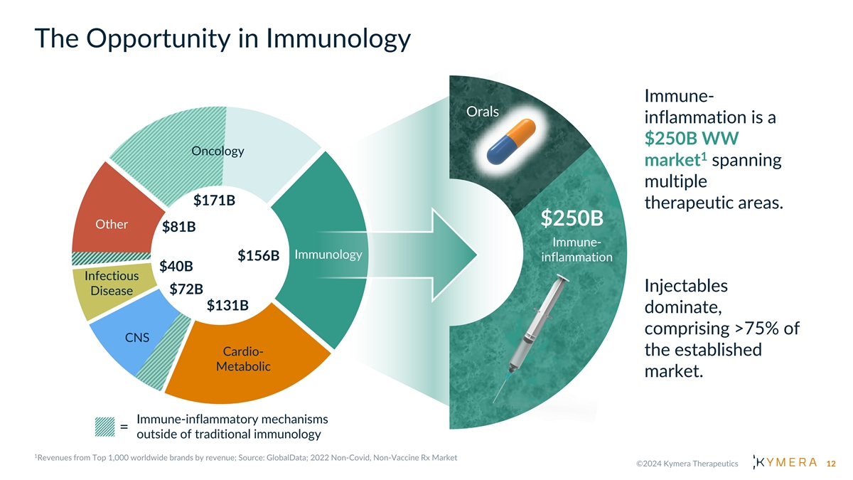 The Opportunity in Immunology Immune- Orals inflammation is a $250B WW Oncology 1 market spanning multiple $171B therapeutic areas. $250B Other $81B Immune- Immunology $156B inflammation $40B Infectious Injectables $72B Disease $131B dominate, comprising >75% of CNS Cardio- the established Metabolic market. Immune-inflammatory mechanisms = outside of traditional immunology 12