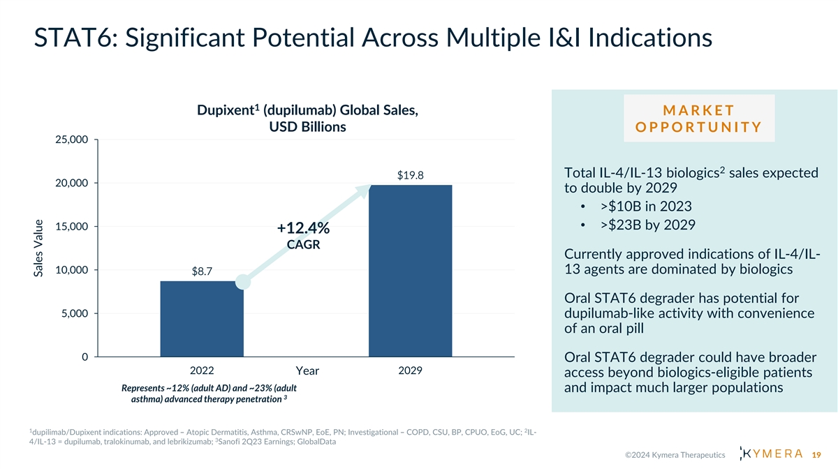 STAT6 Degrader: Dupilumab-like Activity in a Pill S T A T 6 B E S T -IN - P A T H W A Y M E C H A N I S M T R A N S C R I P T I O N F A C T O R IL-4/13 Pathway Clinical pathway validation Dupilumab > Type I IL-4 Type II IL-4 Receptor Receptor IL-4 IL-4 IL-13 Gain of function variants cause Human genetics severe allergic diseases; IL-4Rα γc IL-4Rα IL-13Rα1 > KO phenotype (mouse) normal Undrugged/inadequately Transcription factor, TPD can fully > Cytoplasm drugged by other technologies block target/pathway STAT6 STAT6 Best-in-pathway profile Dupilumab-like activity with oral KT-621 > opportunity small molecule profile Allergic Th2 Inflammation Clear path to early clinical Phase 1/2 efficacy > de-risking STAT6 is the only specific transcription factor responsible Dupilumab indications (AD, Asthma, for IL-4/13 signaling Access large clinical and COPD, CRSwNP, EoE, PN, others), > commercial opportunities mega-blockbuster potential 18