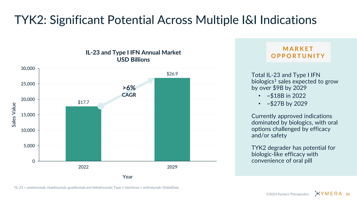 TYK2: Significant Potential Across Multiple I&I Indications M A R K E T IL-23 and Type I IFN Annual Market O P P O R T U N I T Y USD Billions 30,000 $26.9 Total IL-23 and Type I IFN 1 biologics sales expected to grow 25,000 >6% by over $9B by 2029 CAGR • ~$18B in 2022 20,000 $17.7 • ~$27B by 2029 15,000 Currently approved indications dominated by biologics, with oral options challenged by efficacy 10,000 and/or safety 5,000 TYK2 degrader has potential for biologic-like efficacy with 0 convenience of oral pill 2022 2029 Year 21 Sales Value