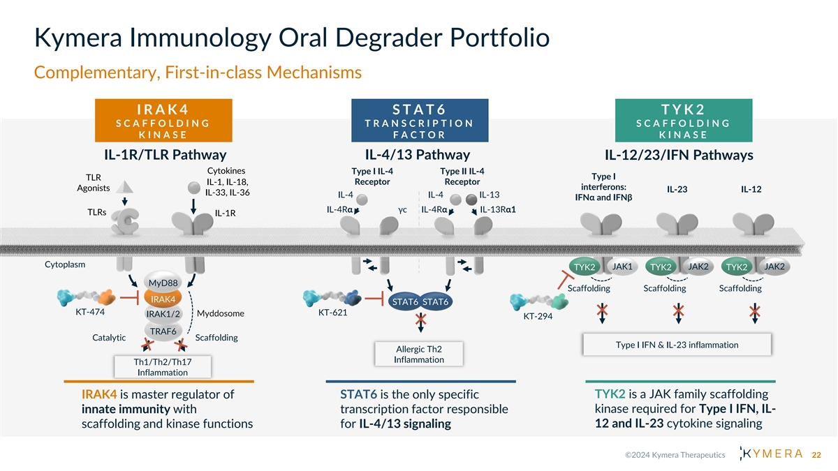 Kymera Immunology Oral Degrader Portfolio Complementary, First-in-class Mechanisms I R A K 4 S T A T 6 T Y K 2 S C A F F O L D I N G T R A N S C R I P T I O N S C A F F O L D I N G K I N A S E F A C T O R K I N A S E IL-1R/TLR Pathway IL-4/13 Pathway IL-12/23/IFN Pathways Cytokines Type I IL-4 Type II IL-4 Type I TLR IL-1, IL-18, Receptor Receptor interferons: Agonists IL-23 IL-12 IL-33, IL-36 IL-4 IL-4 IL-13 IFNα and IFNβ IL-4Rα γc IL-4Rα IL-13Rα1 TLRs IL-1R Cytoplasm JAK1 JAK2 JAK2 TYK2 TYK2 TYK2 MyD88 Scaffolding Scaffolding Scaffolding IRAK4 STAT6 STAT6 KT-474 KT-621 Myddosome IRAK1/2 KT-294 TRAF6 Catalytic Scaffolding Type I IFN & IL-23 inflammation Allergic Th2 Inflammation Th1/Th2/Th17 Inflammation IRAK4 is master regulator of STAT6 is the only specific TYK2 is a JAK family scaffolding innate immunity with transcription factor responsible kinase required for Type I IFN, IL- 12 and IL-23 cytokine signaling scaffolding and kinase functions for IL-4/13 signaling 22