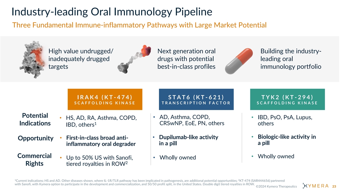 Industry-leading Oral Immunology Pipeline Three Fundamental Immune-inflammatory Pathways with Large Market Potential High value undrugged/ Next generation oral Building the industry- inadequately drugged drugs with potential leading oral targets best-in-class profiles immunology portfolio I R A K 4 ( K T -474) S T A T 6 ( K T -621) T Y K 2 ( K T -294) S C A F F O L D I N G K I N A S E T R A N S C R I P T I O N F A C T O R S C A F F O L D I N G K I N A S E Potential • AD, Asthma, COPD, • IBD, PsO, PsA, Lupus, • HS, AD, RA, Asthma, COPD, 1 CRSwNP, EoE, PN, others Indications others IBD, others • Biologic-like activity in • Dupilumab-like activity • First-in-class broad anti- Opportunity a pill in a pill inflammatory oral degrader Commercial • Wholly owned • Wholly owned • Up to 50% US with Sanofi, 2 Rights tiered royalties in ROW 23