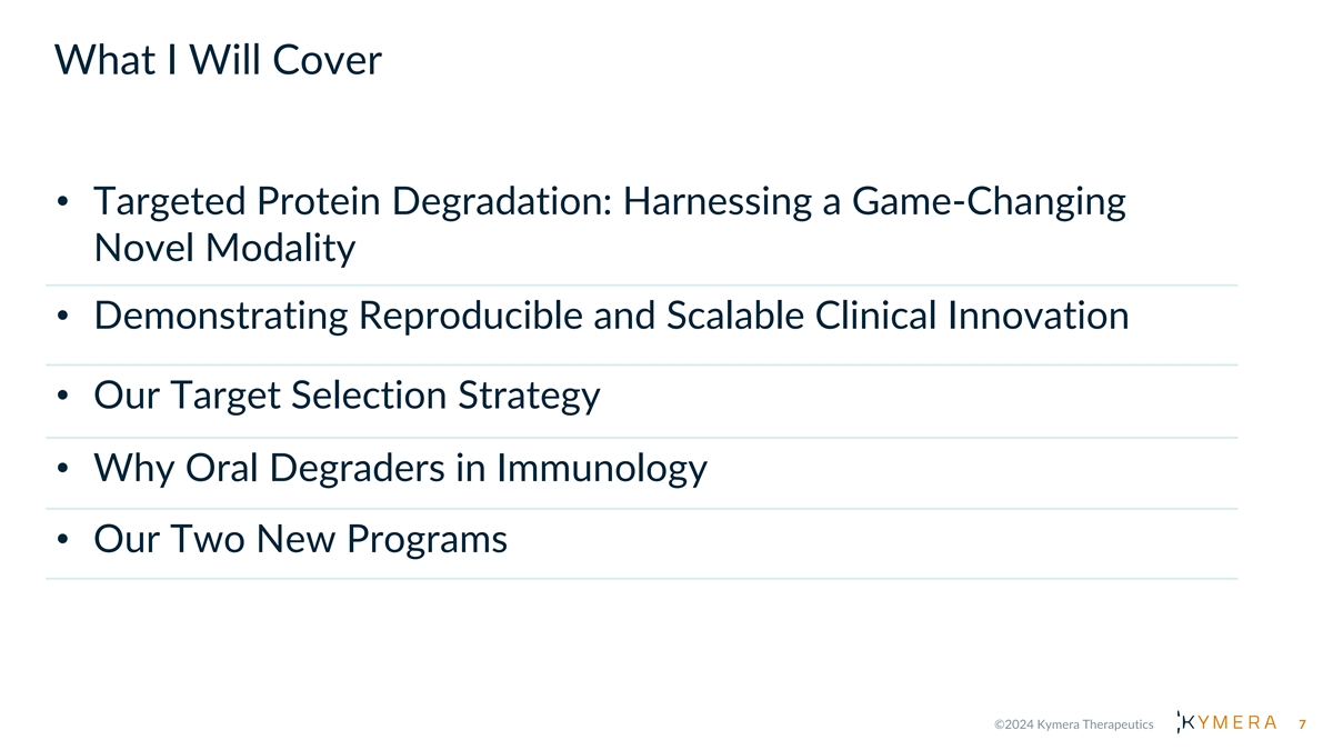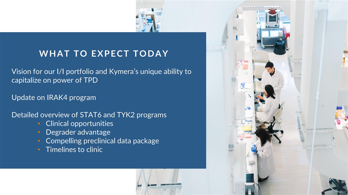 W H A T T O E X P E CT T O D A Y Vision for our I/I portfolio and Kymera’s unique ability to capitalize on power of TPD Update on IRAK4 program Detailed overview of STAT6 and TYK2 programs • Clinical opportunities • Degrader advantage • Compelling preclinical data package • Timelines to clinic