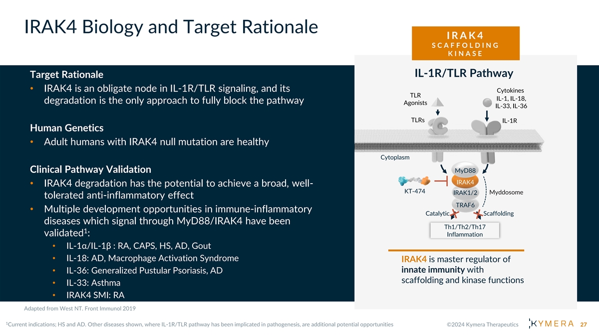 IRAK4: What We Will Cover • Pathway Biology and Validation • Clinical Development/Commercial Opportunities • Degrader Profile and Advantage • Our Clinical Data and Fidelity of Translation • Our Ongoing Phase 2 Studies 26
