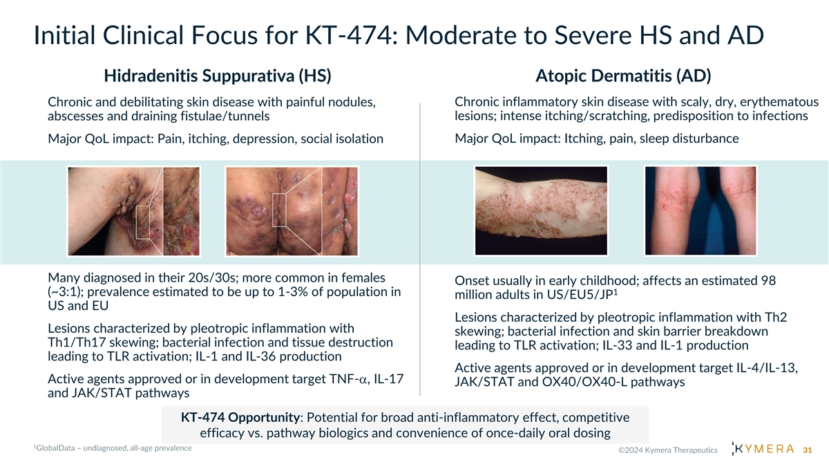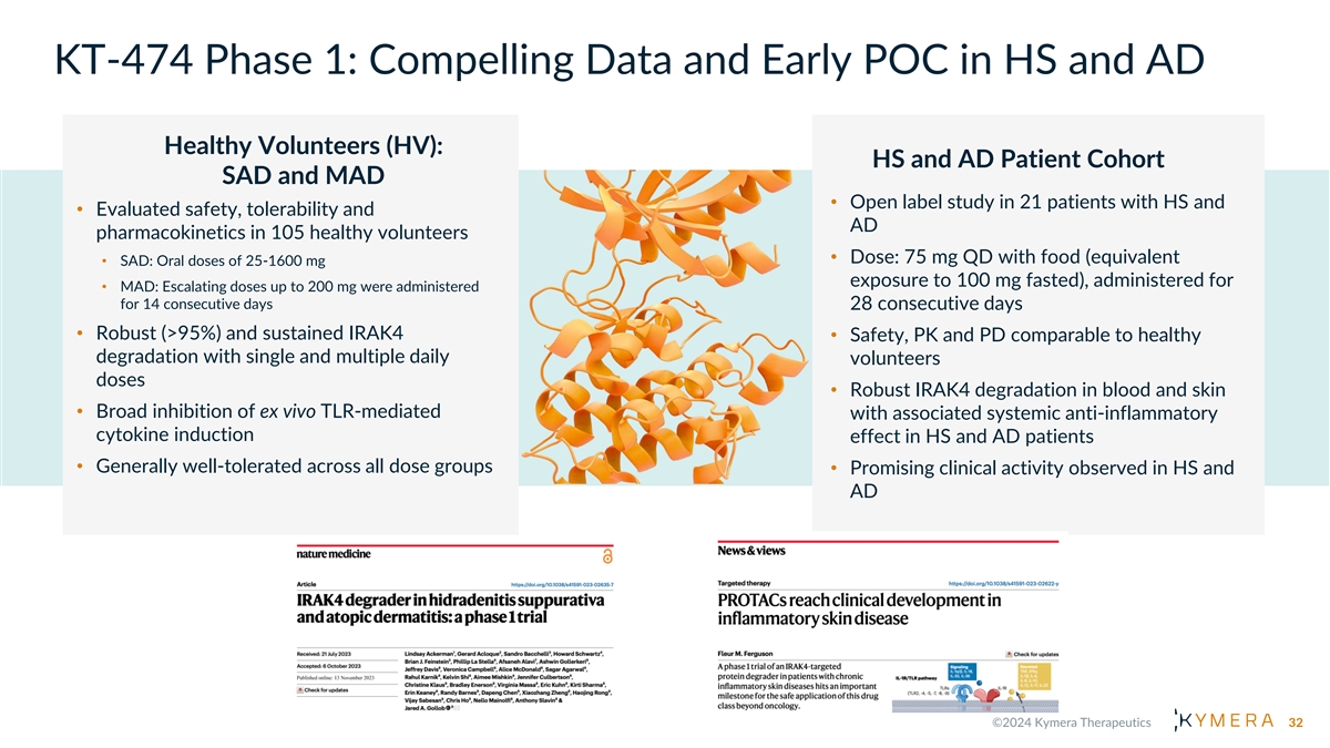 Initial Clinical Focus for KT-474: Moderate to Severe HS and AD Hidradenitis Suppurativa (HS) Atopic Dermatitis (AD) Chronic and debilitating skin disease with painful nodules, Chronic inflammatory skin disease with scaly, dry, erythematous lesions; intense itching/scratching, predisposition to infections abscesses and draining fistulae/tunnels Major QoL impact: Pain, itching, depression, social isolation Major QoL impact: Itching, pain, sleep disturbance Many diagnosed in their 20s/30s; more common in females Onset usually in early childhood; affects an estimated 98 1 (~3:1); prevalence estimated to be up to 1-3% of population in million adults in US/EU5/JP US and EU Lesions characterized by pleotropic inflammation with Th2 Lesions characterized by pleotropic inflammation with skewing; bacterial infection and skin barrier breakdown Th1/Th17 skewing; bacterial infection and tissue destruction leading to TLR activation; IL-33 and IL-1 production leading to TLR activation; IL-1 and IL-36 production Active agents approved or in development target IL-4/IL-13, Active agents approved or in development target TNF-a, IL-17 JAK/STAT and OX40/OX40-L pathways and JAK/STAT pathways KT-474 Opportunity: Potential for broad anti-inflammatory effect, competitive efficacy vs. pathway biologics and convenience of once-daily oral dosing 31