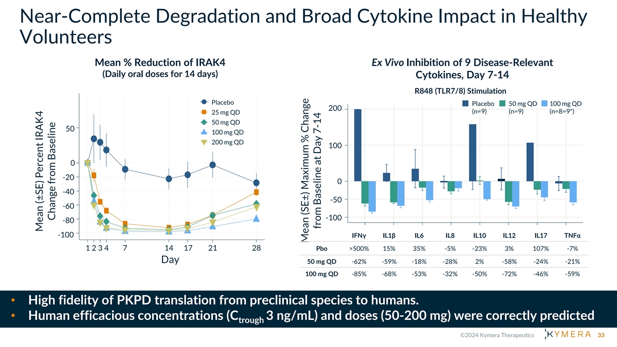KT-474 Phase 1: Compelling Data and Early POC in HS and AD Healthy Volunteers (HV): HS and AD Patient Cohort SAD and MAD • Open label study in 21 patients with HS and • Evaluated safety, tolerability and AD pharmacokinetics in 105 healthy volunteers • Dose: 75 mg QD with food (equivalent • SAD: Oral doses of 25-1600 mg exposure to 100 mg fasted), administered for • MAD: Escalating doses up to 200 mg were administered for 14 consecutive days 28 consecutive days • Robust (>95%) and sustained IRAK4 • Safety, PK and PD comparable to healthy degradation with single and multiple daily volunteers doses • Robust IRAK4 degradation in blood and skin • Broad inhibition of ex vivo TLR-mediated with associated systemic anti-inflammatory cytokine induction effect in HS and AD patients • Generally well-tolerated across all dose groups • Promising clinical activity observed in HS and AD 32