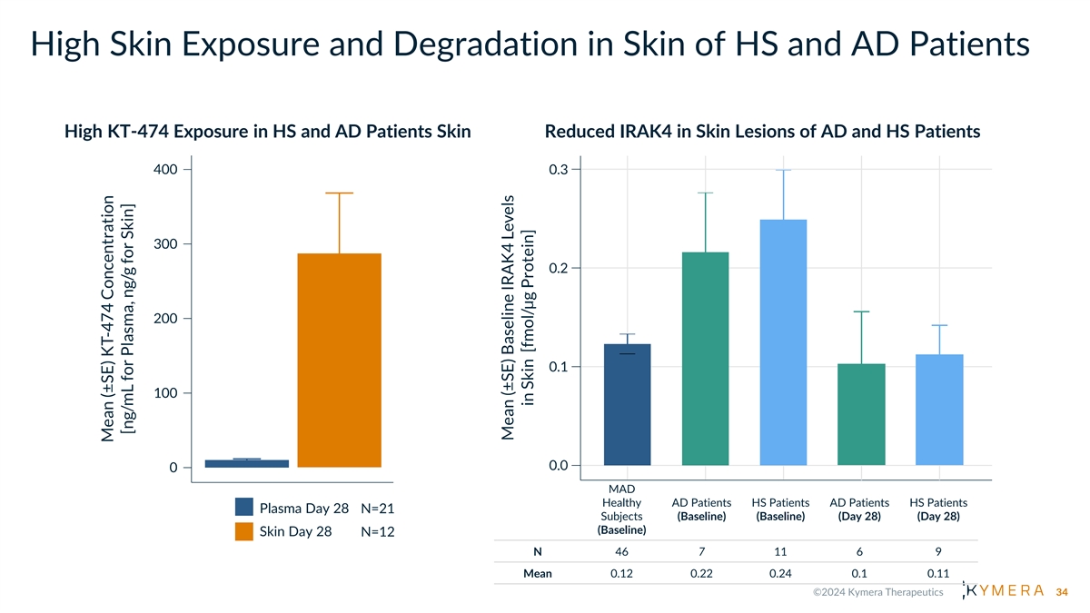 High Skin Exposure and Degradation in Skin of HS and AD Patients High KT-474 Exposure in HS and AD Patients Skin Reduced IRAK4 in Skin Lesions of AD and HS Patients MAD Healthy AD Patients HS Patients AD Patients HS Patients Plasma Day 28 N=21 Subjects (Baseline) (Baseline) (Day 28) (Day 28) (Baseline) Skin Day 28 N=12 N 46 7 11 6 9 Mean 0.12 0.22 0.24 0.1 0.11 34