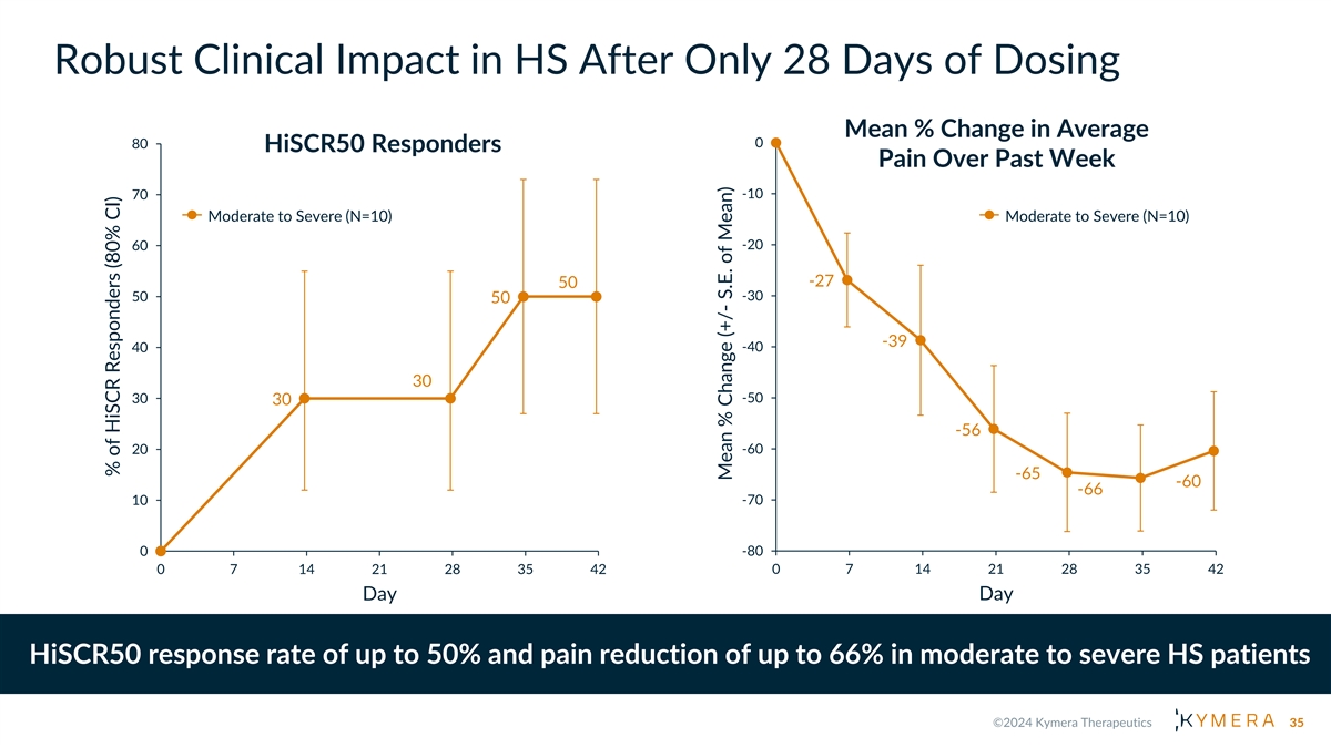 Robust Clinical Impact in HS After Only 28 Days of Dosing Mean % Change in Average 80 0 HiSCR50 Responders Pain Over Past Week -10 70 Moderate to Severe (N=10) Moderate to Severe (N=10) -20 60 -27 50 -30 50 50 -39 40 -40 30 30 -50 30 -56 20 -60 -65 -60 -66 10 -70 -80 0 0 7 14 21 28 35 42 0 7 14 21 28 35 42 Day Day HiSCR50 response rate of up to 50% and pain reduction of up to 66% in moderate to severe HS patients 35 % of HiSCR Responders (80% CI) Mean % Change (+/- S.E. of Mean)