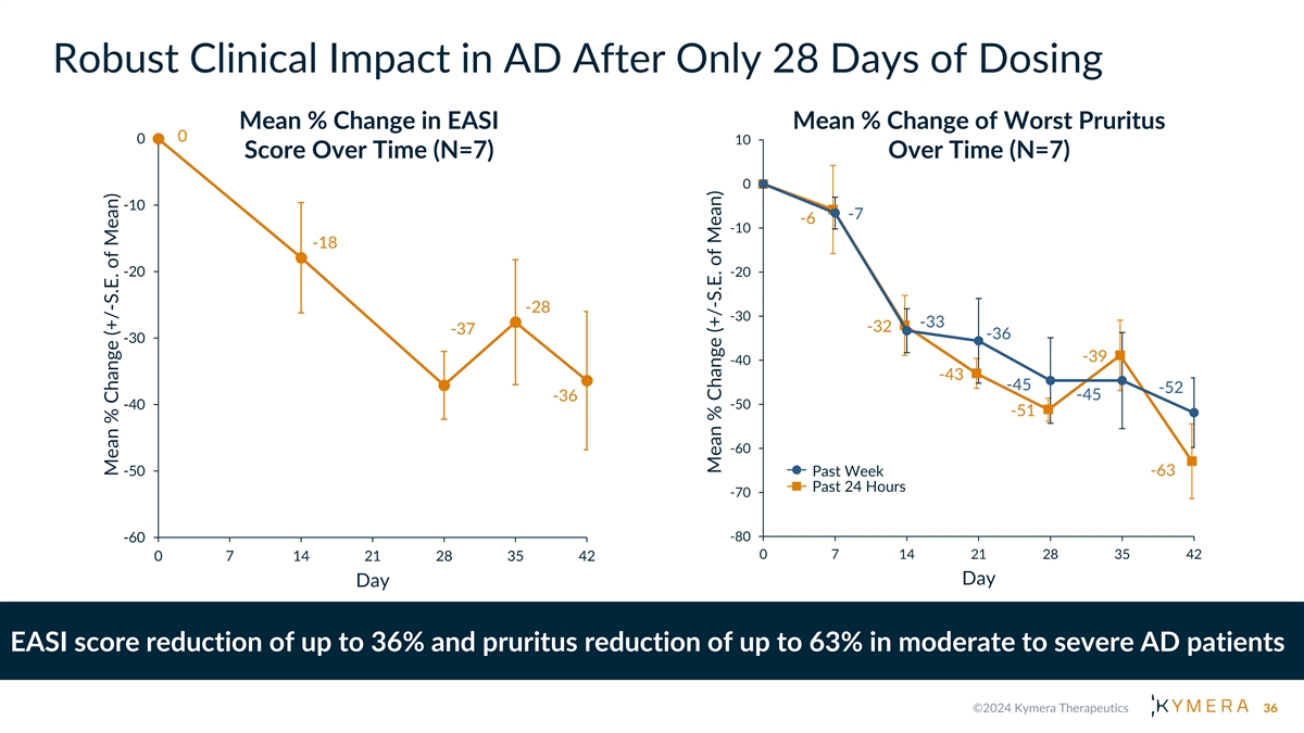 Robust Clinical Impact in AD After Only 28 Days of Dosing Mean % Change in EASI Mean % Change of Worst Pruritus 0 0 10 Score Over Time (N=7) Over Time (N=7) 0 -10 -7 -6 -10 -18 -20 -20 -28 -30 -33 -32 -37 -36 -30 -39 -40 -43 -45 -52 -45 -36 -50 -40 -51 -60 -50 Past Week -63 Past 24 Hours -70 -80 -60 0 7 14 21 28 35 42 0 7 14 21 28 35 42 Day Day EASI score reduction of up to 36% and pruritus reduction of up to 63% in moderate to severe AD patients 36 Mean % Change (+/-S.E. of Mean) Mean % Change (+/-S.E. of Mean)