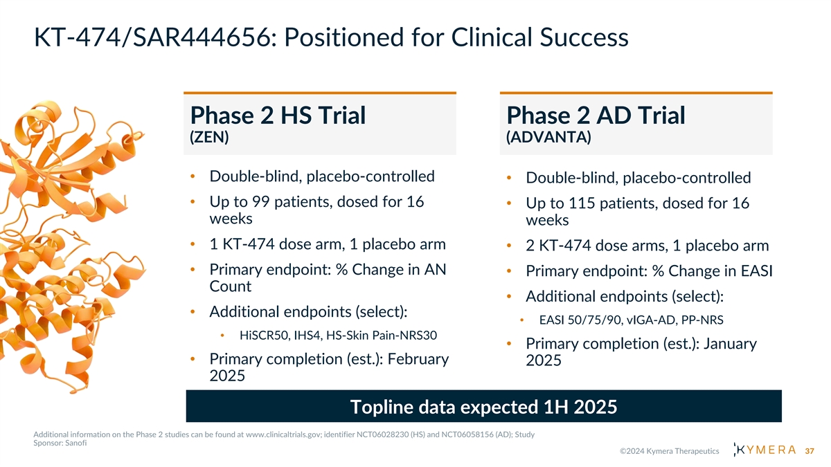 KT-474/SAR444656: Positioned for Clinical Success Phase 2 HS Trial Phase 2 AD Trial (ZEN) (ADVANTA) • Double-blind, placebo-controlled • Double-blind, placebo-controlled • Up to 99 patients, dosed for 16 • Up to 115 patients, dosed for 16 weeks weeks • 1 KT-474 dose arm, 1 placebo arm • 2 KT-474 dose arms, 1 placebo arm • Primary endpoint: % Change in AN • Primary endpoint: % Change in EASI Count • Additional endpoints (select): • Additional endpoints (select): • EASI 50/75/90, vIGA-AD, PP-NRS • HiSCR50, IHS4, HS-Skin Pain-NRS30 • Primary completion (est.): January • Primary completion (est.): February 2025 2025 Topline data expected 1H 2025 37