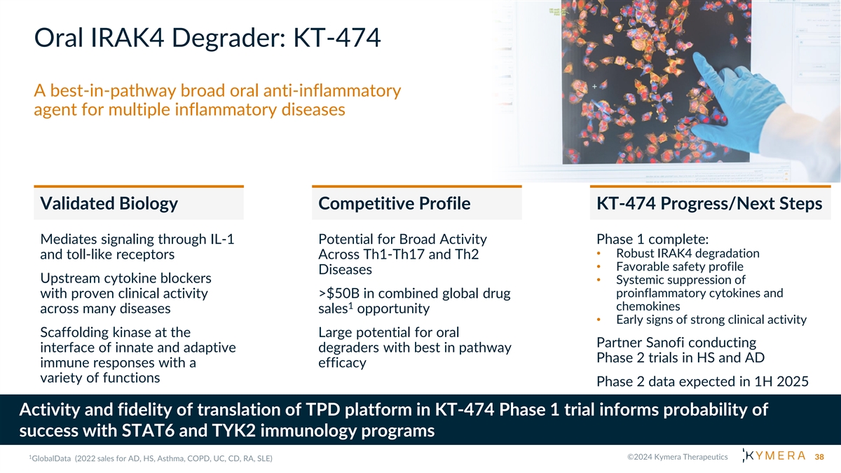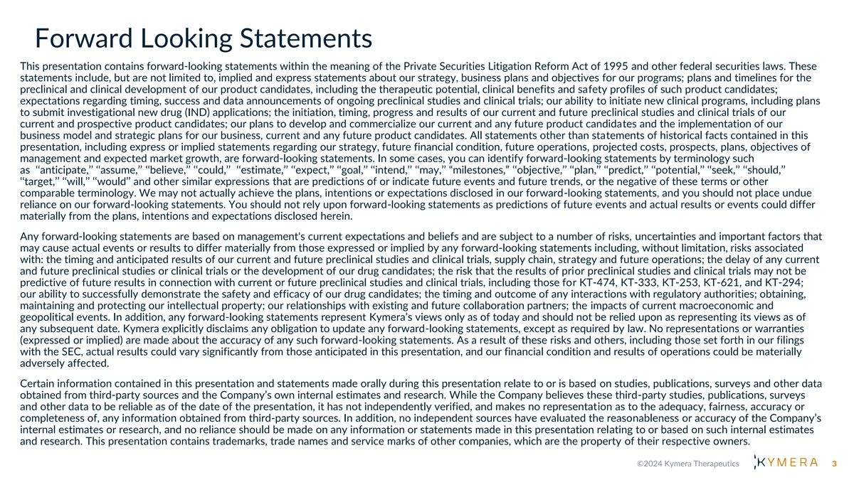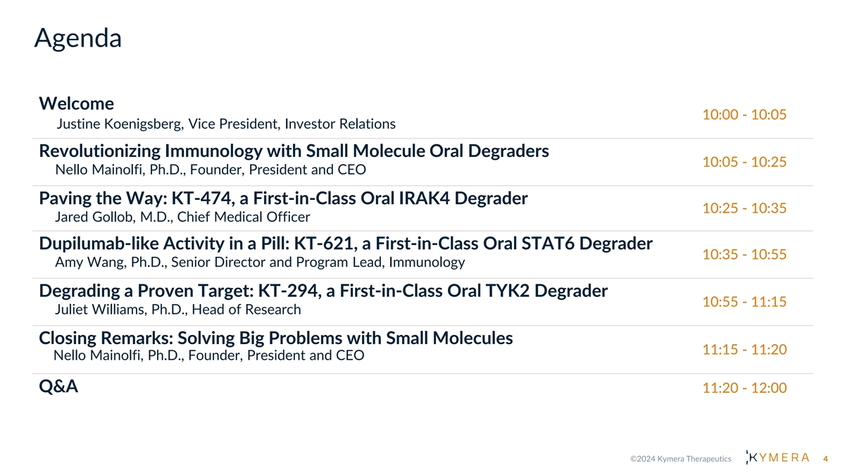 Forward Looking Statements This presentation contains forward-looking statements within the meaning of the Private Securities Litigation Reform Act of 1995 and other federal securities laws. These statements include, but are not limited to, implied and express statements about our strategy, business plans and objectives for our programs; plans and timelines for the preclinical and clinical development of our product candidates, including the therapeutic potential, clinical benefits and safety profiles of such product candidates; expectations regarding timing, success and data announcements of ongoing preclinical studies and clinical trials; our ability to initiate new clinical programs, including plans to submit investigational new drug (IND) applications; the initiation, timing, progress and results of our current and future preclinical studies and clinical trials of our current and prospective product candidates; our plans to develop and commercialize our current and any future product candidates and the implementation of our business model and strategic plans for our business, current and any future product candidates. All statements other than statements of historical facts contained in this presentation, including express or implied statements regarding our strategy, future financial condition, future operations, projected costs, prospects, plans, objectives of management and expected market growth, are forward-looking statements. In some cases, you can identify forward-looking statements by terminology such as ‘‘anticipate,’’ ‘‘assume,’’ ‘‘believe,’’ ‘‘could,’’ ‘‘estimate,’’ ‘‘expect,’’ ‘‘goal,’’ ‘‘intend,’’ ‘‘may,’’ “milestones,” ‘‘objective,’’ ‘‘plan,’’ ‘‘predict,’’ ‘‘potential,’’ ‘‘seek,’’ ‘‘should,’’ ‘‘target,’’ ‘‘will,’’ ‘‘would’’ and other similar expressions that are predictions of or indicate future events and future trends, or the negative of these terms or other comparable terminology. We may not actually achieve the plans, intentions or expectations disclosed in our forward-looking statements, and you should not place undue reliance on our forward-looking statements. You should not rely upon forward-looking statements as predictions of future events and actual results or events could differ materially from the plans, intentions and expectations disclosed herein. Any forward-looking statements are based on management's current expectations and beliefs and are subject to a number of risks, uncertainties and important factors that may cause actual events or results to differ materially from those expressed or implied by any forward-looking statements including, without limitation, risks associated with: the timing and anticipated results of our current and future preclinical studies and clinical trials, supply chain, strategy and future operations; the delay of any current and future preclinical studies or clinical trials or the development of our drug candidates; the risk that the results of prior preclinical studies and clinical trials may not be predictive of future results in connection with current or future preclinical studies and clinical trials, including those for KT-474, KT-333, KT-253, KT-621, and KT-294; our ability to successfully demonstrate the safety and efficacy of our drug candidates; the timing and outcome of any interactions with regulatory authorities; obtaining, maintaining and protecting our intellectual property; our relationships with existing and future collaboration partners; the impacts of current macroeconomic and geopolitical events. In addition, any forward-looking statements represent Kymera’s views only as of today and should not be relied upon as representing its views as of any subsequent date. Kymera explicitly disclaims any obligation to update any forward-looking statements, except as required by law. No representations or warranties (expressed or implied) are made about the accuracy of any such forward-looking statements. As a result of these risks and others, including those set forth in our filings with the SEC, actual results could vary significantly from those anticipated in this presentation, and our financial condition and results of operations could be materially adversely affected. Certain information contained in this presentation and statements made orally during this presentation relate to or is based on studies, publications, surveys and other data obtained from third-party sources and the Company’s own internal estimates and research. While the Company believes these third-party studies, publications, surveys and other data to be reliable as of the date of the presentation, it has not independently verified, and makes no representation as to the adequacy, fairness, accuracy or completeness of, any information obtained from third-party sources. In addition, no independent sources have evaluated the reasonableness or accuracy of the Company’s internal estimates or research, and no reliance should be made on any information or statements made in this presentation relating to or based on such internal estimates and research. This presentation contains trademarks, trade names and service marks of other companies, which are the property of their respective owners. 3