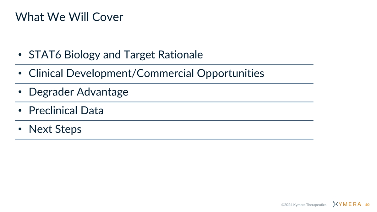 What We Will Cover • STAT6 Biology and Target Rationale • Clinical Development/Commercial Opportunities • Degrader Advantage • Preclinical Data • Next Steps 40