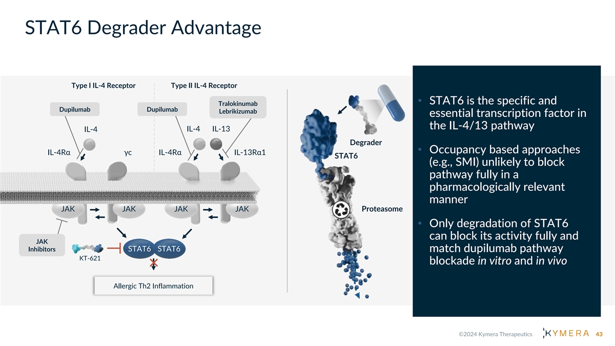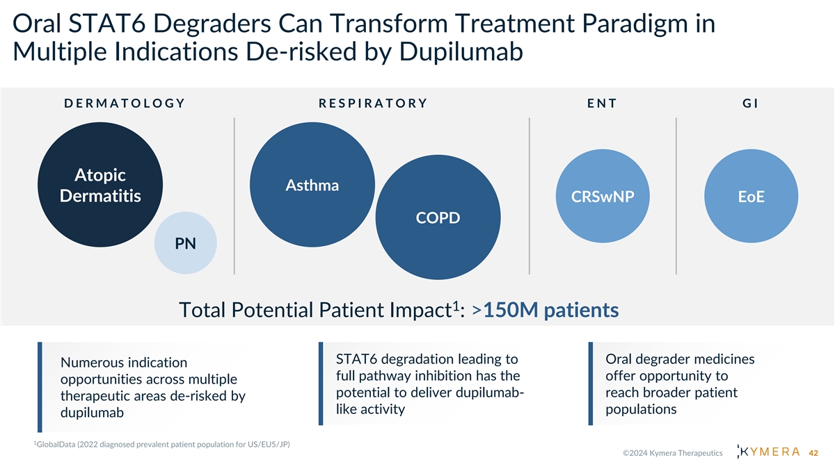Oral STAT6 Degraders Can Transform Treatment Paradigm in Multiple Indications De-risked by Dupilumab D E R M A T O L O G Y R E S P I R A T O R Y ENT GI Atopic Asthma Dermatitis CRSwNP EoE COPD PN 1 Total Potential Patient Impact : >150M patients STAT6 degradation leading to Oral degrader medicines Numerous indication full pathway inhibition has the offer opportunity to opportunities across multiple potential to deliver dupilumab- reach broader patient therapeutic areas de-risked by like activity populations dupilumab 42