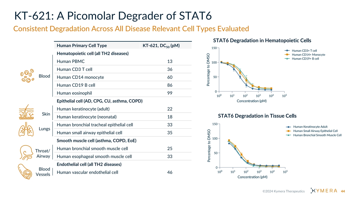 KT-621: A Picomolar Degrader of STAT6 Consistent Degradation Across All Disease Relevant Cell Types Evaluated STAT6 Degradation in Hematopoietic Cells Human Primary Cell Type KT-621, DC (pM) 50 Hematopoietic cell (all TH2 diseases) Human PBMC 13 Human CD3 T cell 36 Blood Human CD14 monocyte 60 Human CD19 B cell 86 Human eosinophil 99 Epithelial cell (AD, CPG, CU, asthma, COPD) Human keratinocyte (adult) 22 Skin STAT6 Degradation in Tissue Cells Human keratinocyte (neonatal) 18 Human bronchial tracheal epithelial cell 33 Lungs Human small airway epithelial cell 35 Smooth muscle cell (asthma, COPD, EoE) Human bronchial smooth muscle cell 25 Throat/ Airway Human esophageal smooth muscle cell 33 Endothelial cell (all TH2 diseases) Blood Human vascular endothelial cell 46 Vessels 44