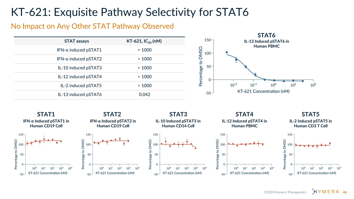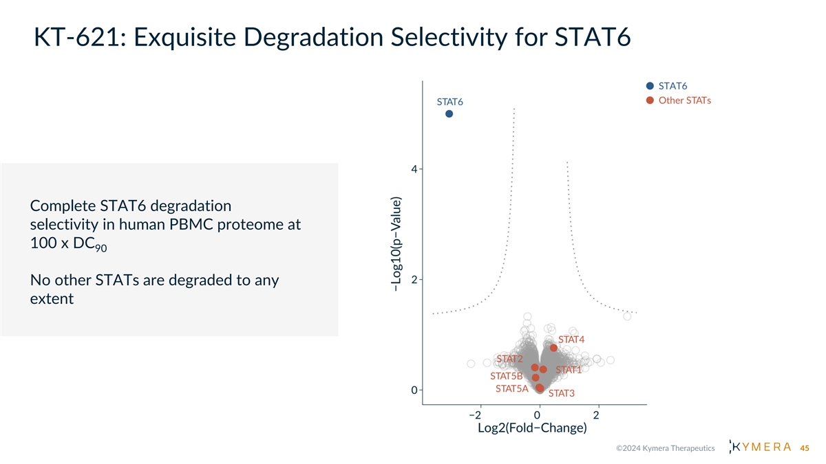 KT-621: Exquisite Degradation Selectivity for STAT6 Complete STAT6 degradation selectivity in human PBMC proteome at 100 x DC 90 No other STATs are degraded to any extent 45