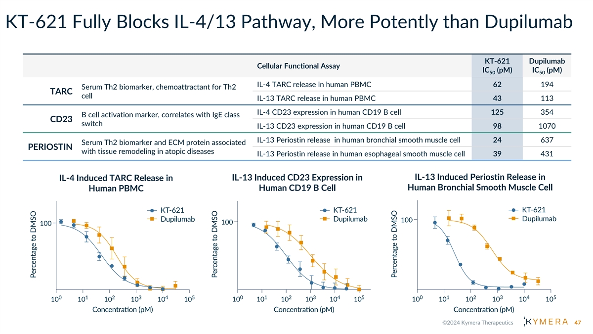 KT-621 Fully Blocks IL-4/13 Pathway, More Potently than Dupilumab KT-621 Dupilumab Cellular Functional Assay IC (pM) IC (pM) 50 50 IL-4 TARC release in human PBMC 62 194 Serum Th2 biomarker, chemoattractant for Th2 TARC cell IL-13 TARC release in human PBMC 43 113 IL-4 CD23 expression in human CD19 B cell 125 354 B cell activation marker, correlates with IgE class CD23 switch IL-13 CD23 expression in human CD19 B cell 98 1070 IL-13 Periostin release in human bronchial smooth muscle cell 24 637 Serum Th2 biomarker and ECM protein associated PERIOSTIN with tissue remodeling in atopic diseases IL-13 Periostin release in human esophageal smooth muscle cell 39 431 IL-13 Induced Periostin Release in IL-13 Induced CD23 Expression in IL-4 Induced TARC Release in Human Bronchial Smooth Muscle Cell Human CD19 B Cell Human PBMC 47