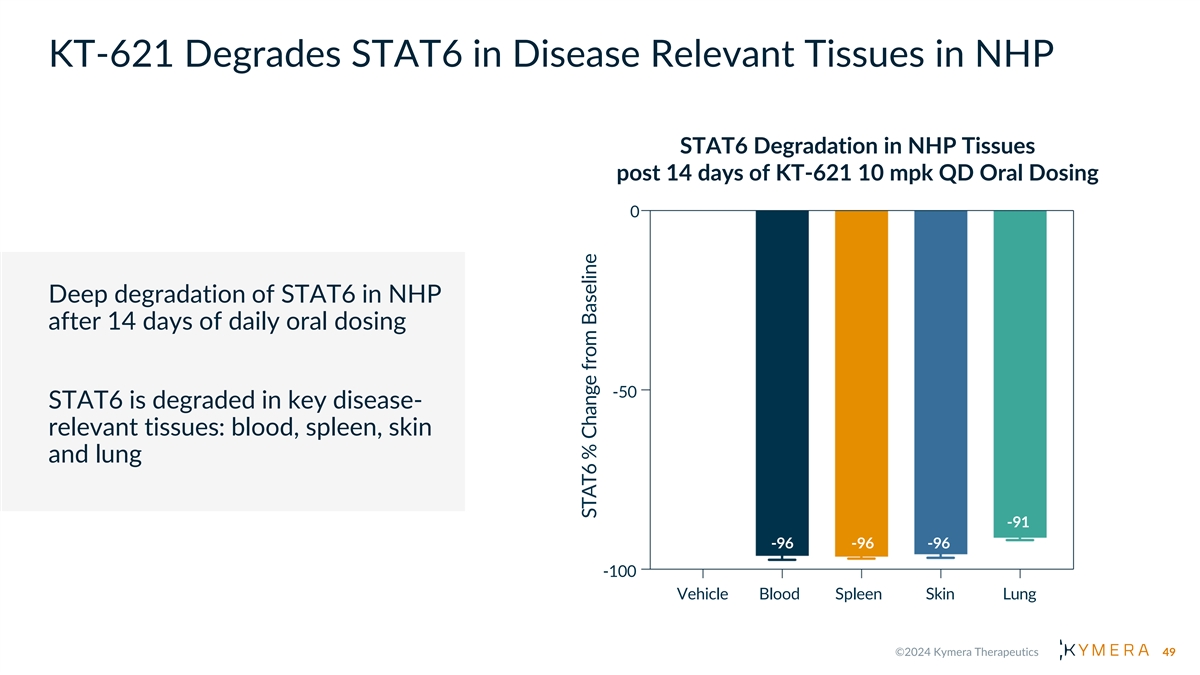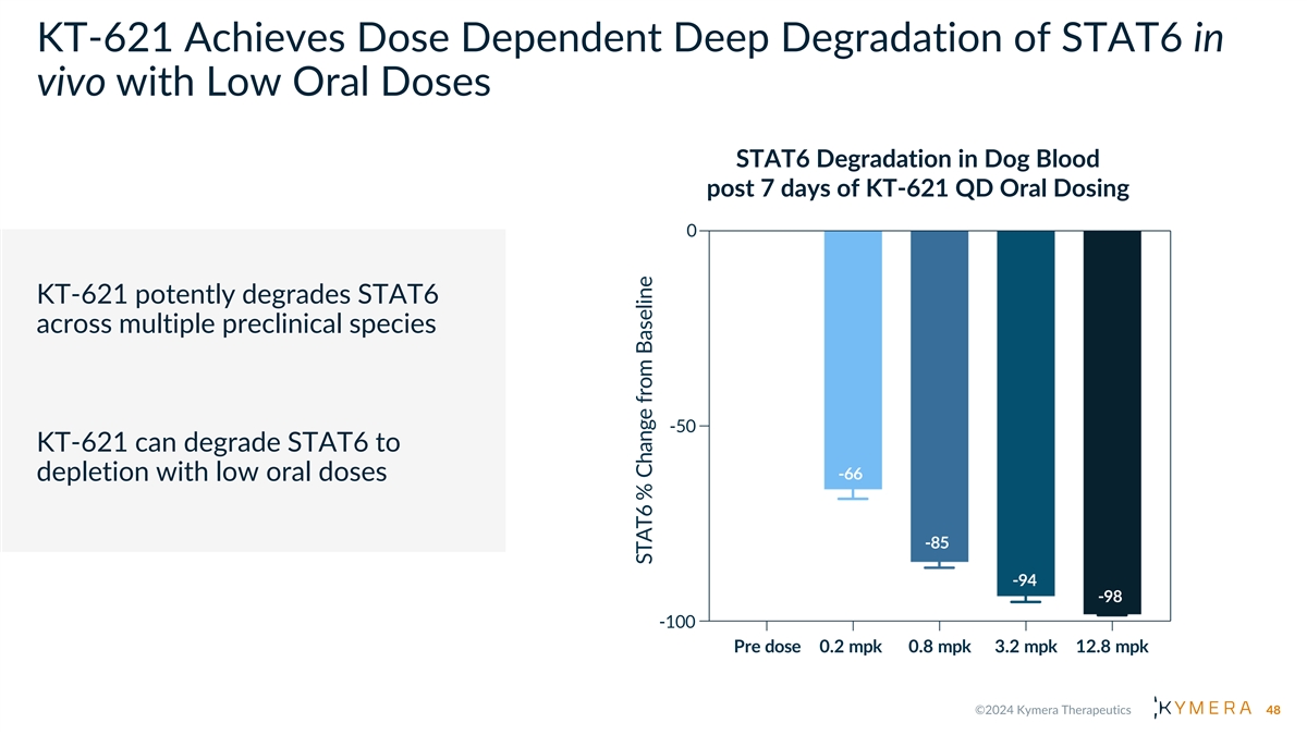 KT-621 Achieves Dose Dependent Deep Degradation of STAT6 in vivo with Low Oral Doses STAT6 Degradation in Dog Blood post 7 days of KT-621 QD Oral Dosing 0 KT-621 potently degrades STAT6 across multiple preclinical species -50 KT-621 can degrade STAT6 to -66 depletion with low oral doses -85 -94 -98 -100 Pre dose 0.2 mpk 0.8 mpk 3.2 mpk 12.8 mpk 48 STAT6 % Change from Baseline