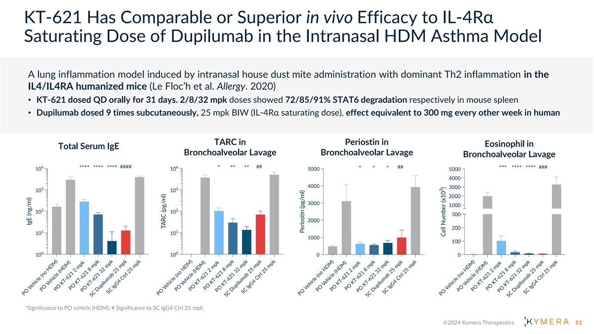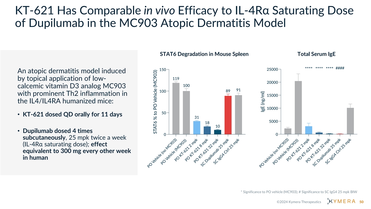 KT-621 Has Comparable in vivo Efficacy to IL-4Rα Saturating Dose of Dupilumab in the MC903 Atopic Dermatitis Model STAT6 Degradation in Mouse Spleen Total Serum IgE An atopic dermatitis model induced by topical application of low- calcemic vitamin D3 analog MC903 with prominent Th2 inflammation in the IL4/IL4RA humanized mice: • KT-621 dosed QD orally for 11 days • Dupilumab dosed 4 times subcutaneously, 25 mpk twice a week (IL-4Rα saturating dose); effect equivalent to 300 mg every other week in human 50