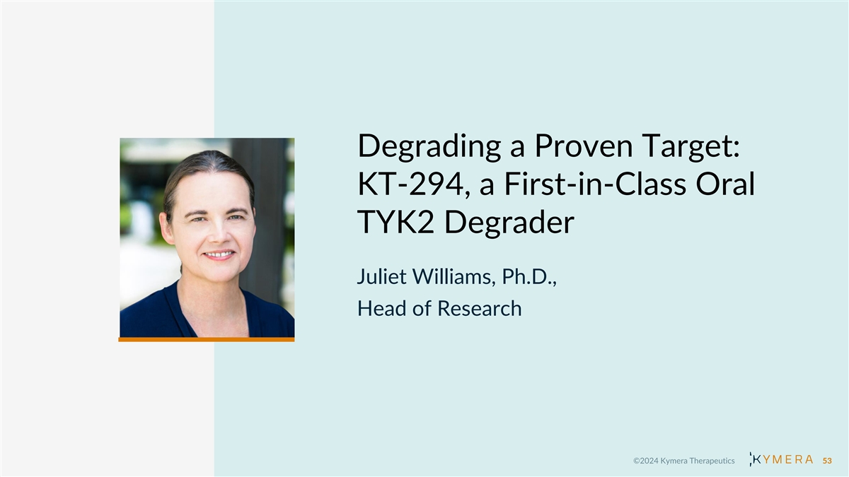 Degrading a Proven Target: KT-294, a First-in-Class Oral TYK2 Degrader Juliet Williams, Ph.D., Head of Research 53