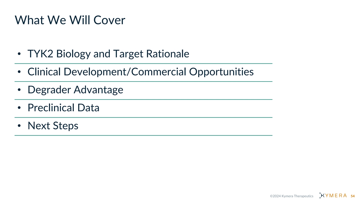 What We Will Cover • TYK2 Biology and Target Rationale • Clinical Development/Commercial Opportunities • Degrader Advantage • Preclinical Data • Next Steps 54