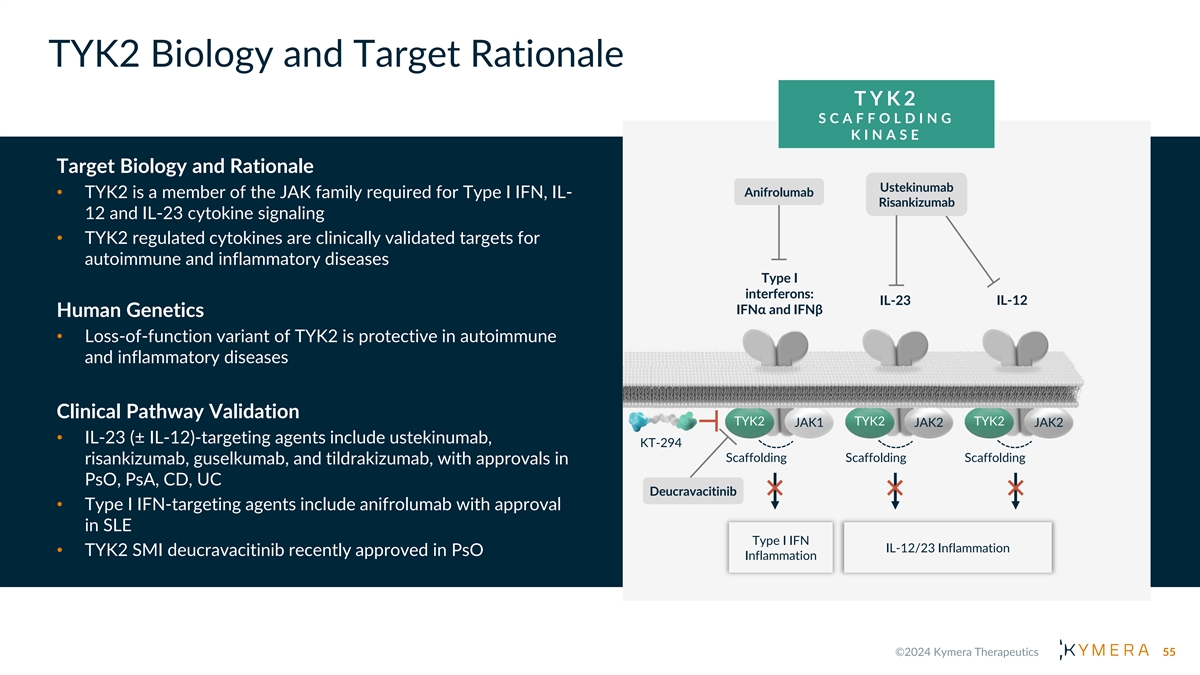 TYK2 Biology and Target Rationale T Y K 2 S C A F F O L D I N G K I N A S E Target Biology and Rationale Ustekinumab Anifrolumab • TYK2 is a member of the JAK family required for Type I IFN, IL- Risankizumab 12 and IL-23 cytokine signaling • TYK2 regulated cytokines are clinically validated targets for autoimmune and inflammatory diseases Type I interferons: IL-23 IL-12 IFNα and IFNβ Human Genetics • Loss-of-function variant of TYK2 is protective in autoimmune and inflammatory diseases Clinical Pathway Validation TYK2 TYK2 TYK2 JAK1 JAK2 JAK2 • IL-23 (± IL-12)-targeting agents include ustekinumab, KT-294 Scaffolding Scaffolding Scaffolding risankizumab, guselkumab, and tildrakizumab, with approvals in PsO, PsA, CD, UC Deucravacitinib • Type I IFN-targeting agents include anifrolumab with approval in SLE Type I IFN IL-12/23 Inflammation • TYK2 SMI deucravacitinib recently approved in PsO Inflammation 55