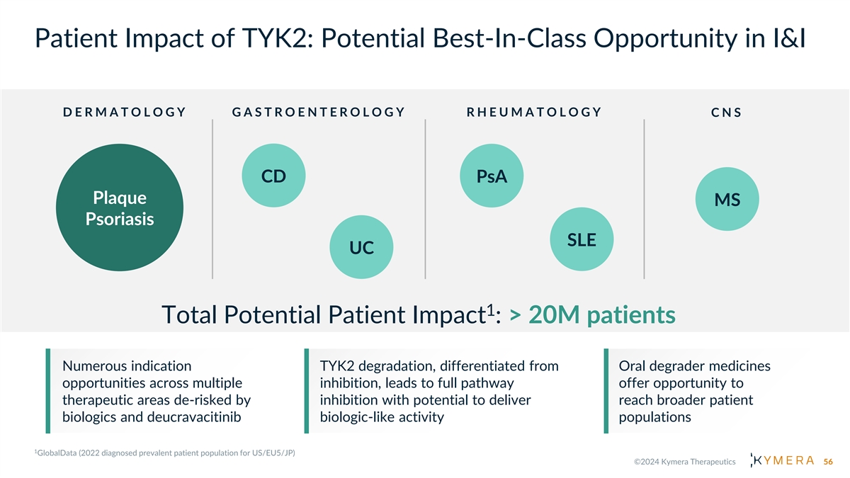 Patient Impact of TYK2: Potential Best-In-Class Opportunity in I&I D E R M A T O L O G Y G A S T R O E N T E R O L O G Y R H E U M A T O L O G Y C N S CD PsA Plaque MS Psoriasis SLE UC 1 Total Potential Patient Impact : > 20M patients Numerous indication TYK2 degradation, differentiated from Oral degrader medicines opportunities across multiple inhibition, leads to full pathway offer opportunity to therapeutic areas de-risked by inhibition with potential to deliver reach broader patient biologics and deucravacitinib biologic-like activity populations 56