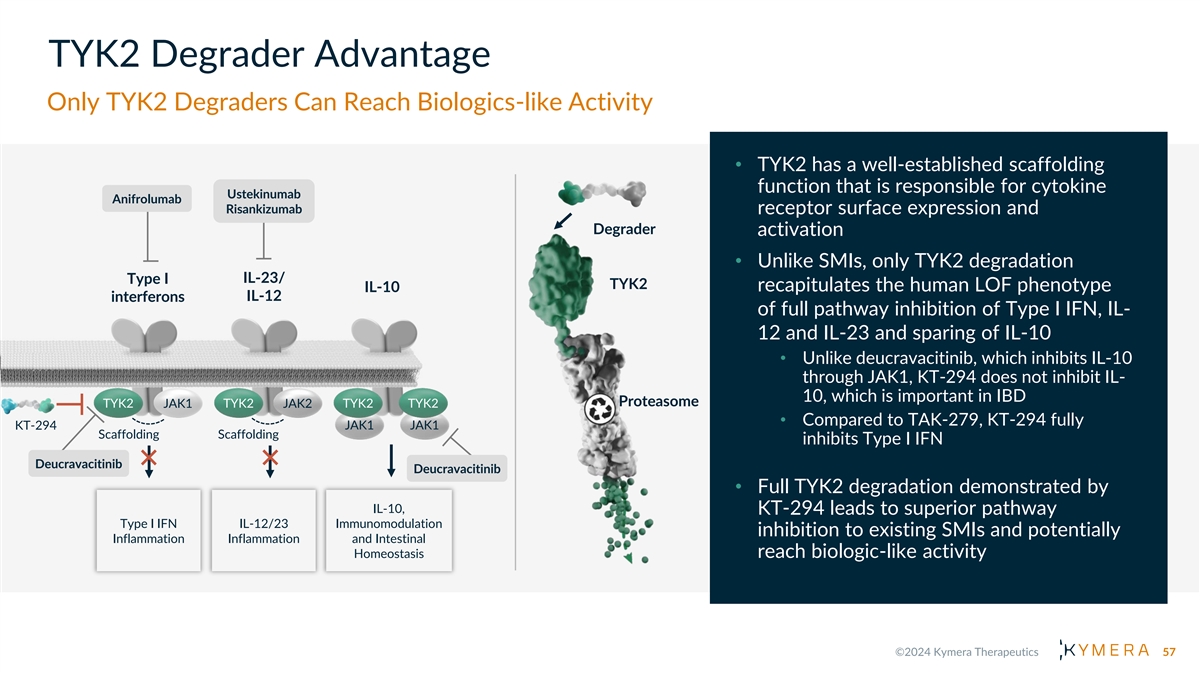 TYK2 Degrader Advantage Only TYK2 Degraders Can Reach Biologics-like Activity • TYK2 has a well-established scaffolding function that is responsible for cytokine Ustekinumab Anifrolumab Risankizumab receptor surface expression and Degrader activation • Unlike SMIs, only TYK2 degradation IL-23/ Type I TYK2 recapitulates the human LOF phenotype IL-10 IL-12 interferons of full pathway inhibition of Type I IFN, IL- 12 and IL-23 and sparing of IL-10 • Unlike deucravacitinib, which inhibits IL-10 through JAK1, KT-294 does not inhibit IL- 10, which is important in IBD Proteasome TYK2 JAK1 TYK2 JAK2 TYK2 TYK2 • Compared to TAK-279, KT-294 fully KT-294 JAK1 JAK1 Scaffolding Scaffolding inhibits Type I IFN Deucravacitinib Deucravacitinib • Full TYK2 degradation demonstrated by IL-10, KT-294 leads to superior pathway Type I IFN IL-12/23 Immunomodulation inhibition to existing SMIs and potentially Inflammation Inflammation and Intestinal Homeostasis reach biologic-like activity 57