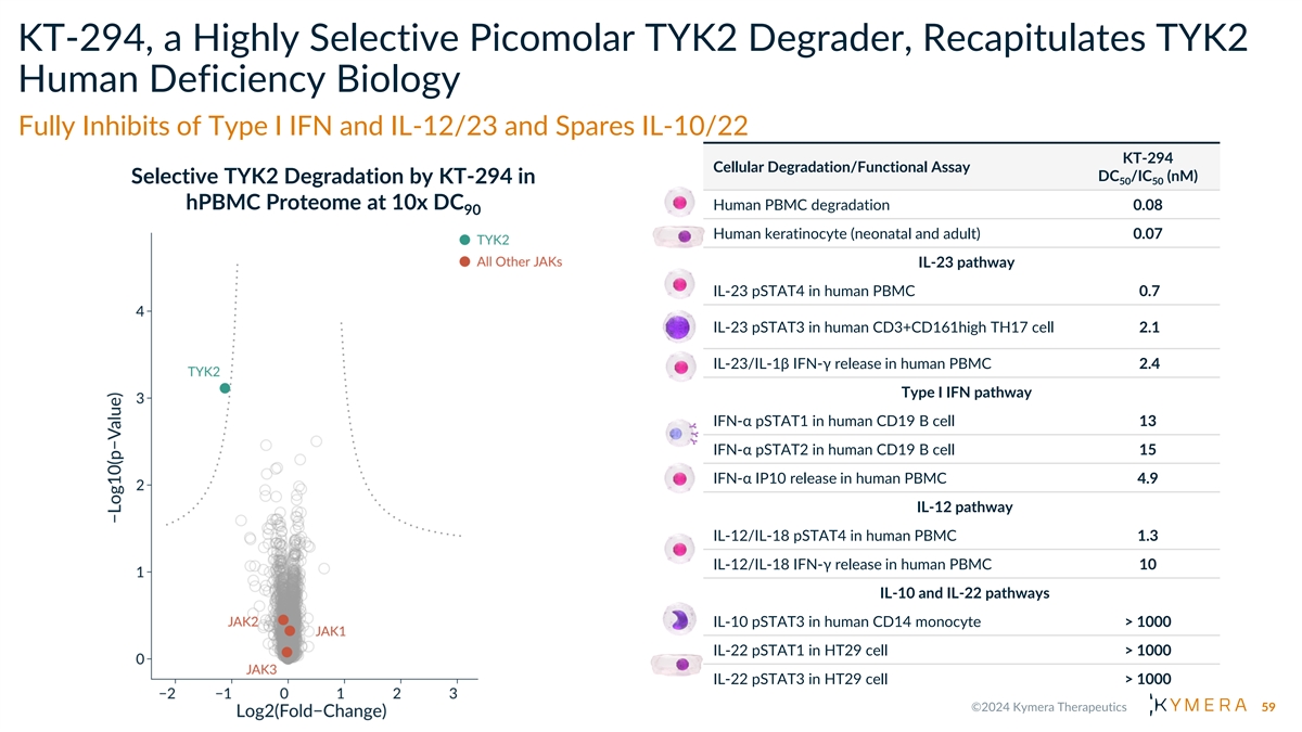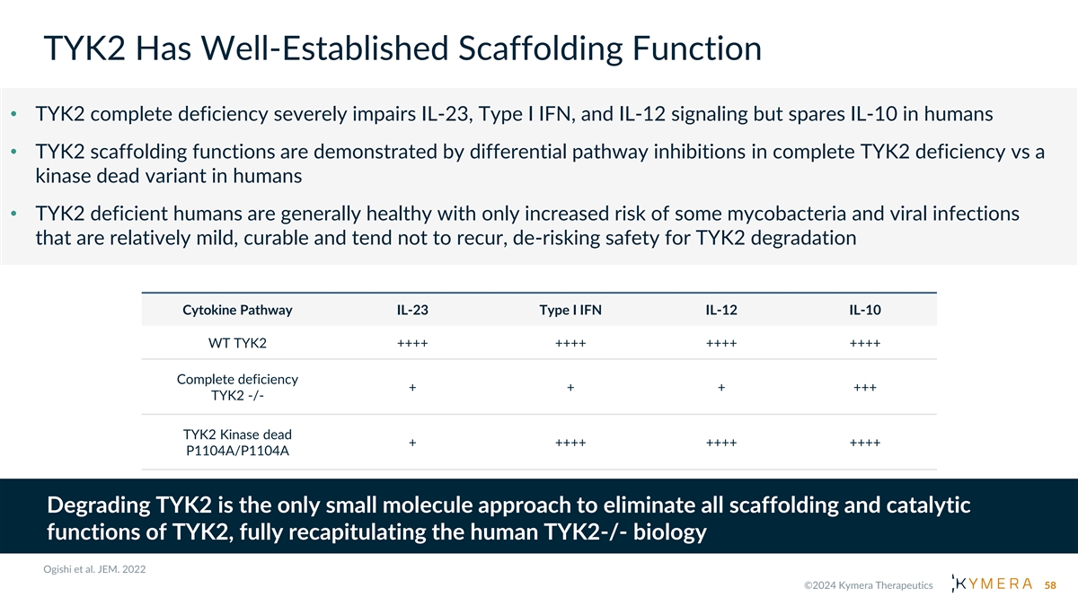 TYK2 Has Well-Established Scaffolding Function • TYK2 complete deficiency severely impairs IL-23, Type I IFN, and IL-12 signaling but spares IL-10 in humans • TYK2 scaffolding functions are demonstrated by differential pathway inhibitions in complete TYK2 deficiency vs a kinase dead variant in humans • TYK2 deficient humans are generally healthy with only increased risk of some mycobacteria and viral infections that are relatively mild, curable and tend not to recur, de-risking safety for TYK2 degradation Cytokine Pathway IL-23 Type I IFN IL-12 IL-10 WT TYK2 ++++ ++++ ++++ ++++ Complete deficiency + + + +++ TYK2 -/- TYK2 Kinase dead + ++++ ++++ ++++ P1104A/P1104A Degrading TYK2 is the only small molecule approach to eliminate all scaffolding and catalytic functions of TYK2, fully recapitulating the human TYK2-/- biology 58