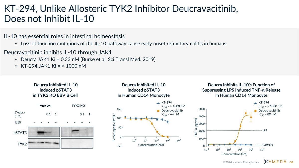 KT-294, Unlike Allosteric TYK2 Inhibitor Deucravacitinib, Does not Inhibit IL-10 IL-10 has essential roles in intestinal homeostasis • Loss of function mutations of the IL-10 pathway cause early onset refractory colitis in humans Deucravacitinib inhibits IL-10 through JAK1 • Deucra JAK1 Ki = 0.33 nM (Burke et al. Sci Transl Med. 2019) • KT-294 JAK1 Ki = > 1000 nM Deucra Inhibited IL-10 Deucra Inhibited IL-10 Deucra Inhibits IL-10’s Function of induced pSTAT3 Induced pSTAT3 Suppressing LPS Induced TNF-α Release in TYK2 KO EBV B Cell in Human CD14 Monocyte in Human CD14 Monocyte KT-294 KT-294 TYK2 KO TYK2 WT IC = > 1000 nM IC = > 1000 nM 50 50 Deucravacitinib Deucravacitinib Deucra 0.1 1 0.1 1 IC = 64 nM IC = 89 nM 50 50 (μM) IL10 - + + + - + + + pSTAT3 TYK2 60