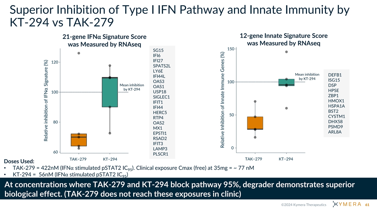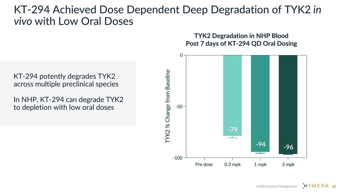 Superior Inhibition of Type I IFN Pathway and Innate Immunity by KT-294 vs TAK-279 12-gene Innate Signature Score 21-gene IFN⍺ Signature Score was Measured by RNAseq was Measured by RNAseq SG15 IFI6 IFI27 SPATS2L LY6E Mean inhibition DEFB1 IFI44L by KT-294 ISG15 OAS3 Mean inhibition DSP OAS1 by KT-294 HPSE USP18 ZBP1 SIGLEC1 HMOX1 IFIT1 HSPA1A IFI44 BST2 HERC5 CYSTM1 RTP4 DHX58 OAS2 PSMD9 MX1 ARL8A EPSTI1 RSAD2 IFIT3 LAMP3 PLSCR1 Doses Used: • TAK-279 = 422nM (IFN⍺ stimulated pSTAT2 IC ). Clinical exposure Cmax (free) at 35mg = ~ 77 nM 95 • KT-294 = 56nM (IFN⍺ stimulated pSTAT2 IC ) 95 At concentrations where TAK-279 and KT-294 block pathway 95%, degrader demonstrates superior biological effect. (TAK-279 does not reach these exposures in clinic) 61