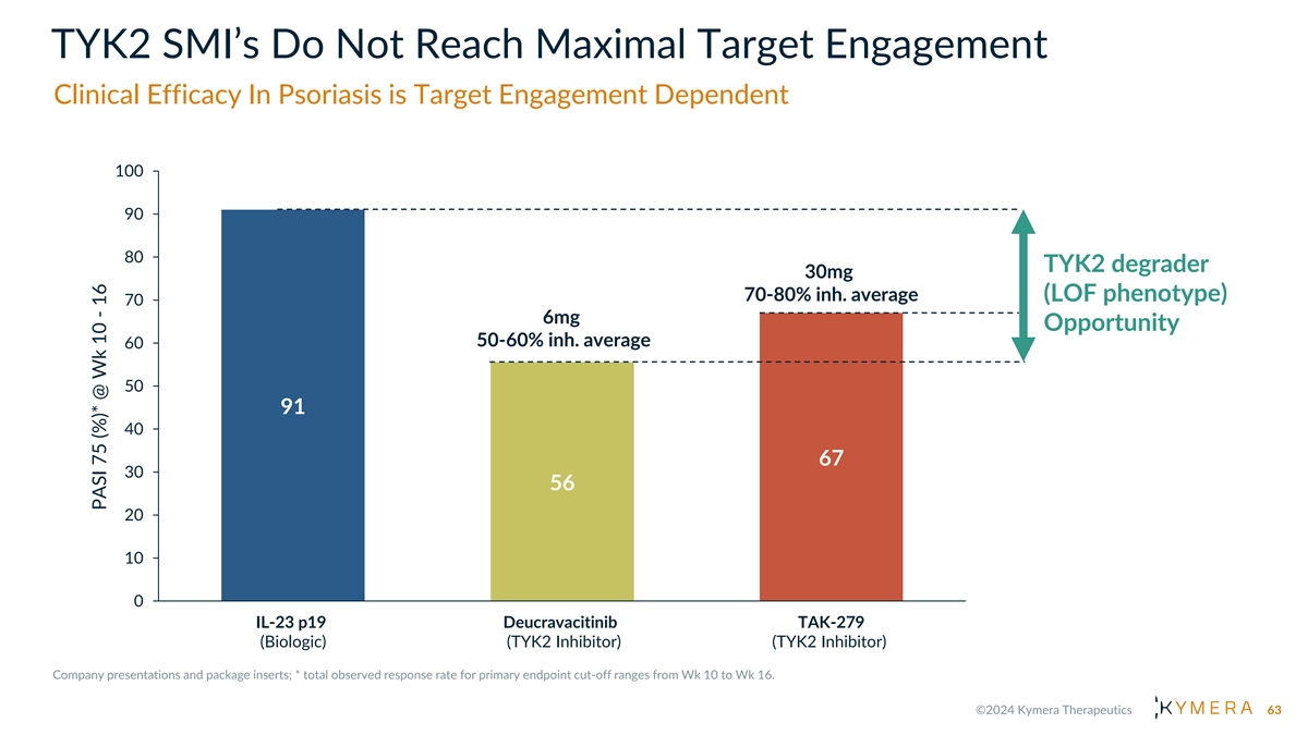 TYK2 SMI’s Do Not Reach Maximal Target Engagement Clinical Efficacy In Psoriasis is Target Engagement Dependent 100 90 80 TYK2 degrader 30mg 70-80% inh. average (LOF phenotype) 70 6mg Opportunity 50-60% inh. average 60 50 91 40 67 30 56 20 10 0 IL-23 p19 Deucravacitinib TAK-279 (Biologic) (TYK2 Inhibitor) (TYK2 Inhibitor) 63 PASI 75 (%)* @ Wk 10 - 16