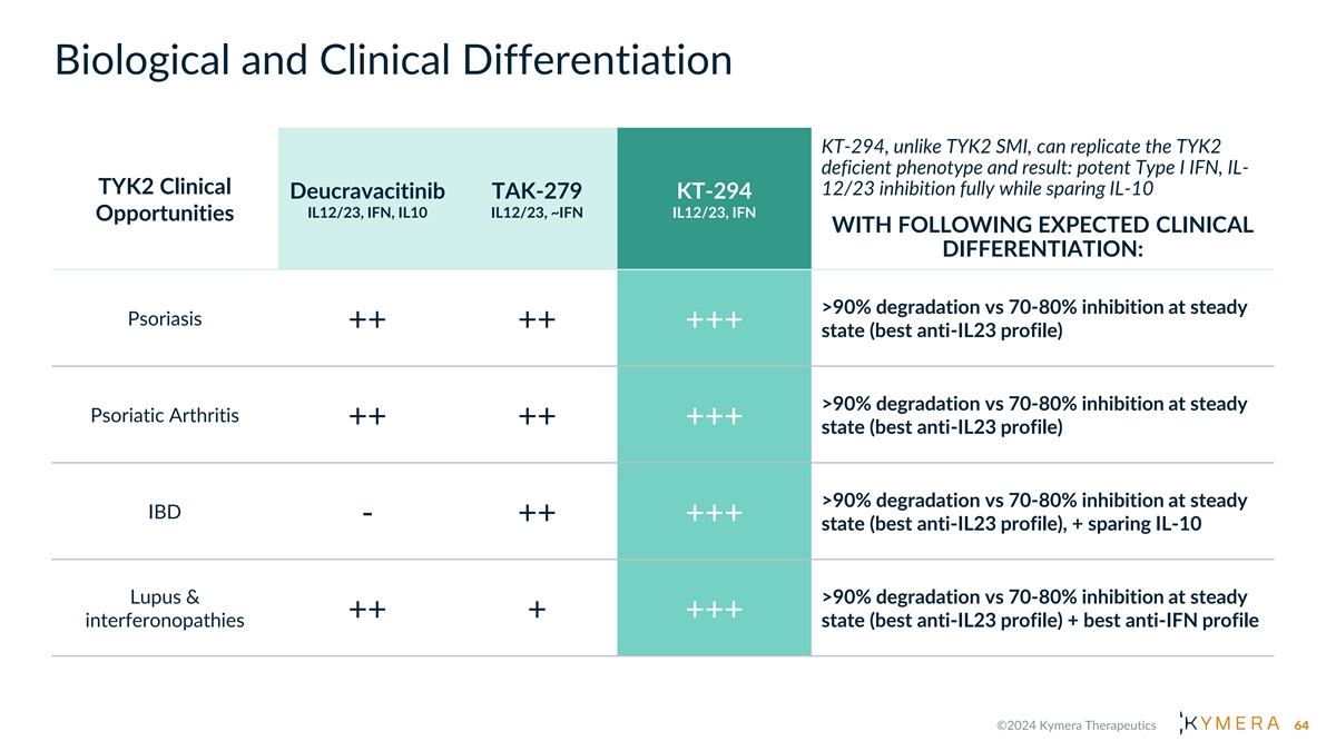 Biological and Clinical Differentiation KT-294, unlike TYK2 SMI, can replicate the TYK2 deficient phenotype and result: potent Type I IFN, IL- TYK2 Clinical 12/23 inhibition fully while sparing IL-10 Deucravacitinib TAK-279 KT-294 IL12/23, IFN, IL10 IL12/23, ~IFN IL12/23, IFN Opportunities WITH FOLLOWING EXPECTED CLINICAL DIFFERENTIATION: >90% degradation vs 70-80% inhibition at steady Psoriasis ++ ++ +++ state (best anti-IL23 profile) >90% degradation vs 70-80% inhibition at steady Psoriatic Arthritis ++ ++ +++ state (best anti-IL23 profile) >90% degradation vs 70-80% inhibition at steady IBD - ++ +++ state (best anti-IL23 profile), + sparing IL-10 Lupus & >90% degradation vs 70-80% inhibition at steady ++ + +++ interferonopathies state (best anti-IL23 profile) + best anti-IFN profile 64