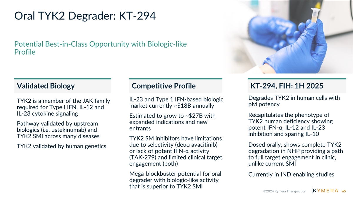 Oral TYK2 Degrader: KT-294 Potential Best-in-Class Opportunity with Biologic-like Profile Validated Biology Competitive Profile KT-294, FIH: 1H 2025 Degrades TYK2 in human cells with IL-23 and Type 1 IFN-based biologic TYK2 is a member of the JAK family pM potency market currently ~$18B annually required for Type I IFN, IL-12 and IL-23 cytokine signaling Recapitulates the phenotype of Estimated to grow to ~$27B with TYK2 human deficiency showing expanded indications and new Pathway validated by upstream potent IFN-α, IL-12 and IL-23 entrants biologics (i.e. ustekinumab) and inhibition and sparing IL-10 TYK2 SMI across many diseases TYK2 SM inhibitors have limitations due to selectivity (deucravacitinib) Dosed orally, shows complete TYK2 TYK2 validated by human genetics or lack of potent IFN-α activity degradation in NHP providing a path (TAK-279) and limited clinical target to full target engagement in clinic, engagement (both) unlike current SMI Mega-blockbuster potential for oral Currently in IND enabling studies degrader with biologic-like activity that is superior to TYK2 SMI 65