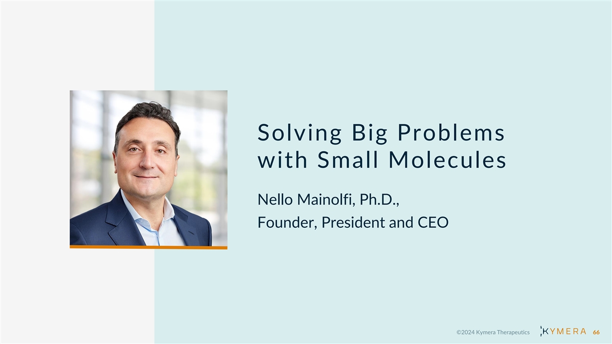 Solving Big Problems with Small Molecules Nello Mainolfi, Ph.D., Founder, President and CEO 66