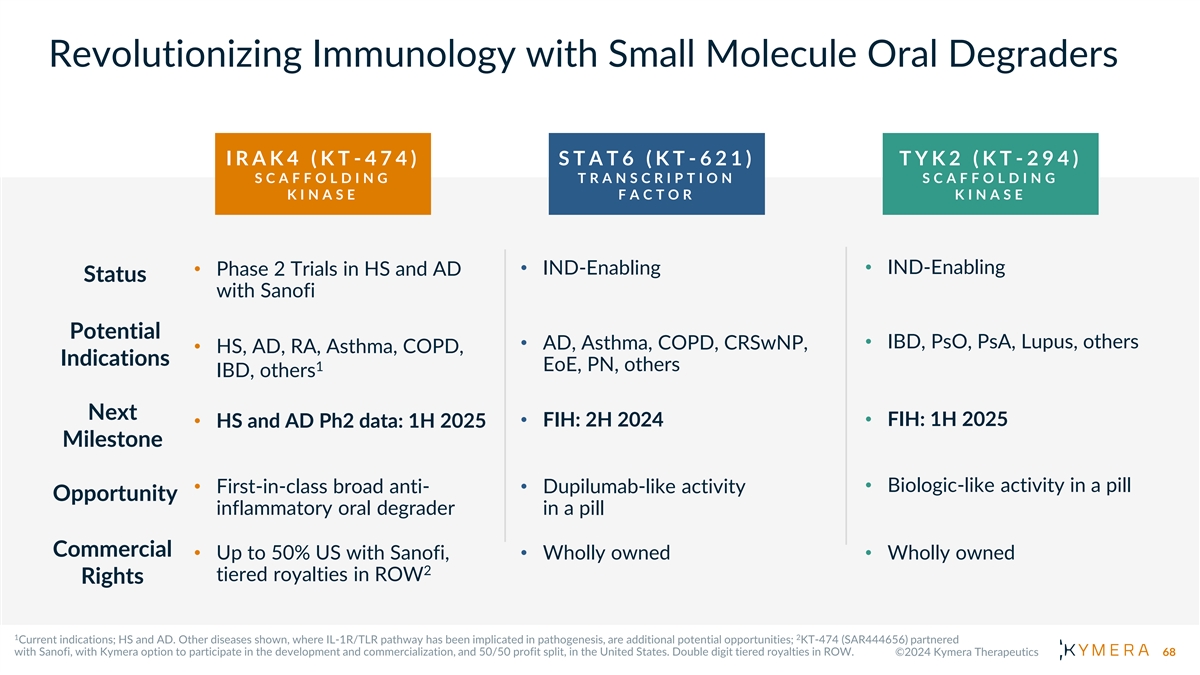 Revolutionizing Immunology with Small Molecule Oral Degraders I R A K 4 ( K T -474) S T A T 6 ( K T -621) T Y K 2 ( K T -294) S C A F F O L D I N G T R A N S C R I P T I O N S C A F F O L D I N G K I N A S E F A C T O R K I N A S E • IND-Enabling • IND-Enabling • Phase 2 Trials in HS and AD Status with Sanofi Potential • IBD, PsO, PsA, Lupus, others • AD, Asthma, COPD, CRSwNP, • HS, AD, RA, Asthma, COPD, Indications 1 EoE, PN, others IBD, others Next • FIH: 2H 2024• FIH: 1H 2025 • HS and AD Ph2 data: 1H 2025 Milestone • Biologic-like activity in a pill • First-in-class broad anti-• Dupilumab-like activity Opportunity inflammatory oral degrader in a pill Commercial • Up to 50% US with Sanofi, • Wholly owned• Wholly owned 2 tiered royalties in ROW Rights 68