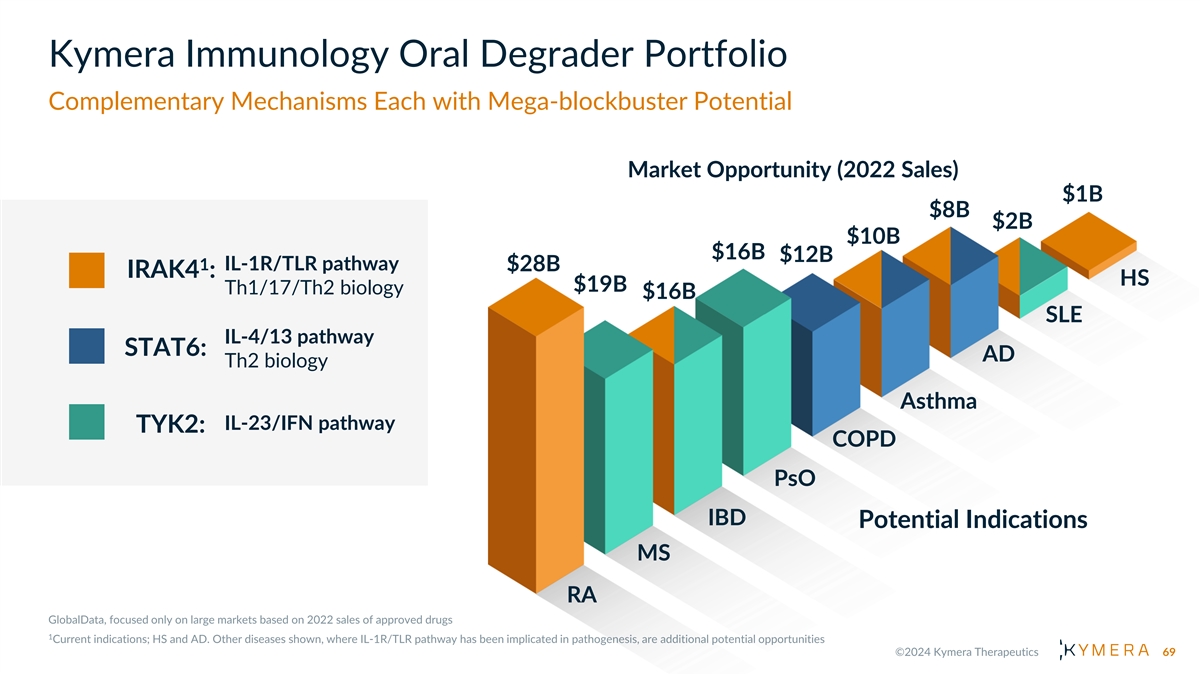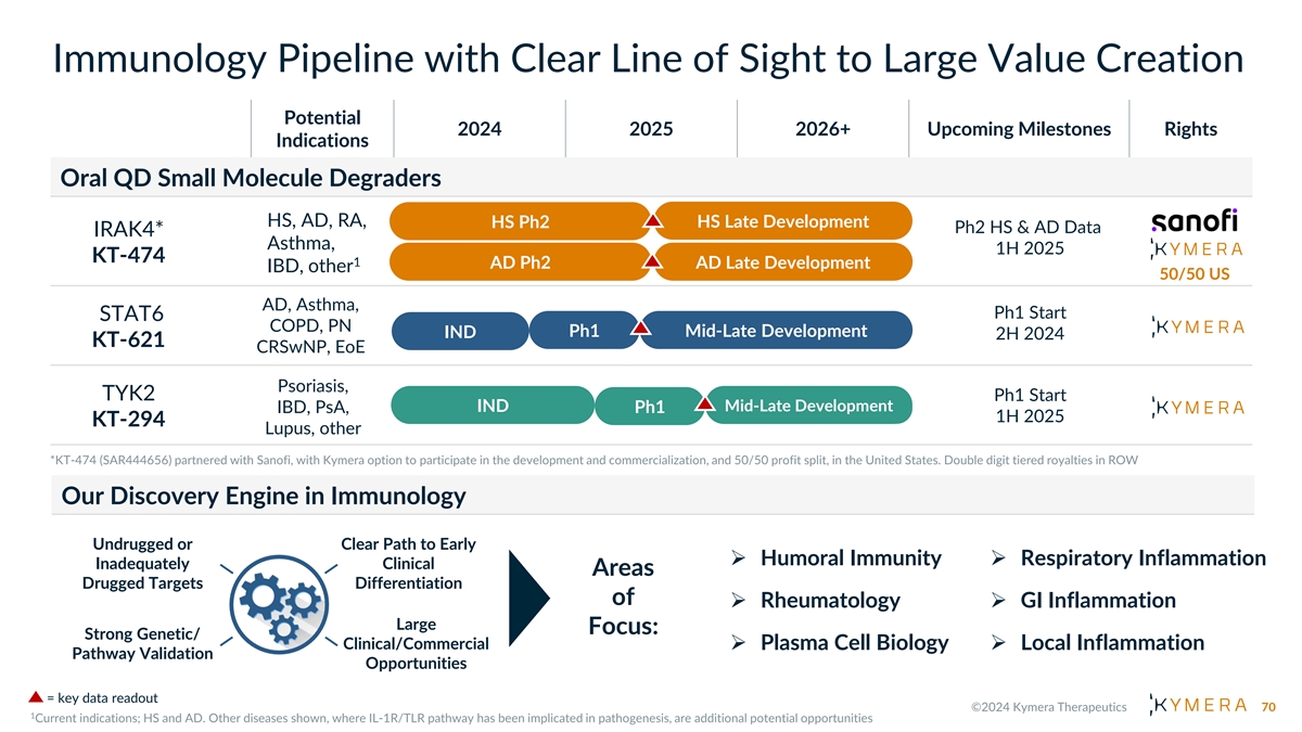 Kymera Immunology Oral Degrader Portfolio Complementary Mechanisms Each with Mega-blockbuster Potential Market Opportunity (2022 Sales) $1B $8B $2B $10B $16B $12B 1 IL-1R/TLR pathway $28B IRAK4 : HS $19B Th1/17/Th2 biology $16B SLE IL-4/13 pathway STAT6: AD Th2 biology Asthma IL-23/IFN pathway TYK2: COPD PsO IBD Potential Indications MS RA 69