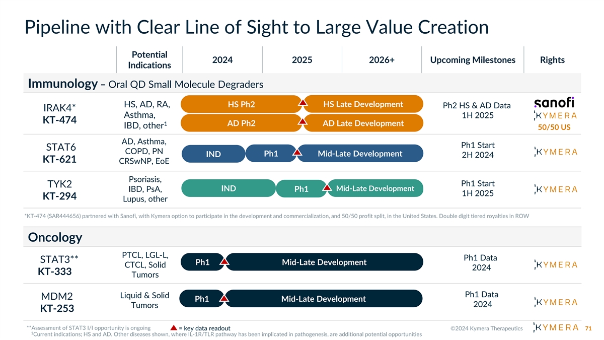 Immunology Pipeline with Clear Line of Sight to Large Value Creation Potential 2024 2025 2026+ Upcoming Milestones Rights Indications Oral QD Small Molecule Degraders HS, AD, RA, HS Ph2 HS Late Development Ph2 HS & AD Data IRAK4* Asthma, 1H 2025 KT-474 1 AD Ph2 AD Late Development IBD, other 50/50 US AD, Asthma, Ph1 Start STAT6 COPD, PN Ph1 Mid-Late Development IND 2H 2024 KT-621 CRSwNP, EoE Psoriasis, TYK2 Ph1 Start Mid-Late IND Mid-Late Development IBD, PsA, Ph1 1H 2025 KT-294 Development Lupus, other Our Discovery Engine in Immunology Undrugged or Clear Path to Early ➢ Humoral Immunity➢ Respiratory Inflammation Inadequately Clinical Areas Drugged Targets Differentiation of ➢ Rheumatology➢ GI Inflammation Large Focus: Strong Genetic/ Clinical/Commercial ➢ Plasma Cell Biology➢ Local Inflammation Pathway Validation Opportunities = key data readout 70